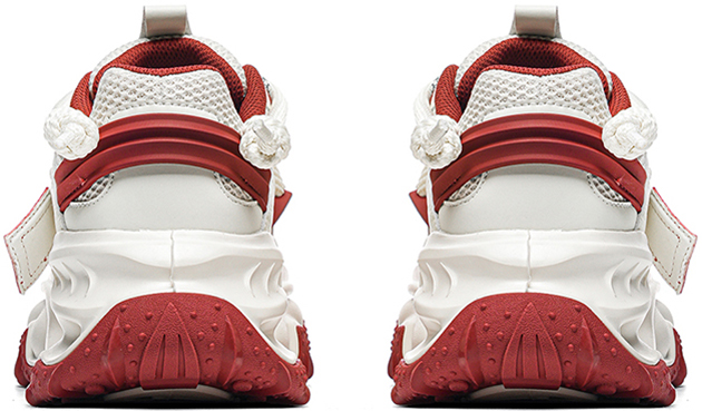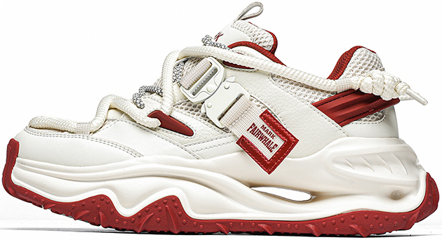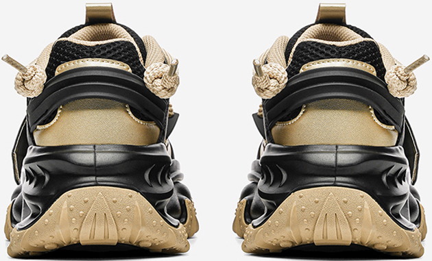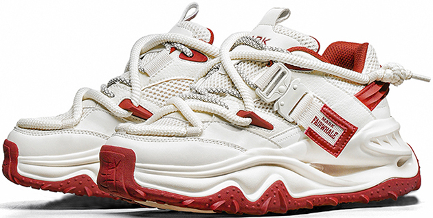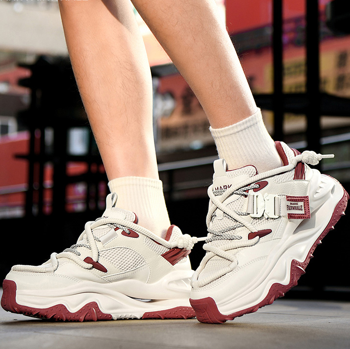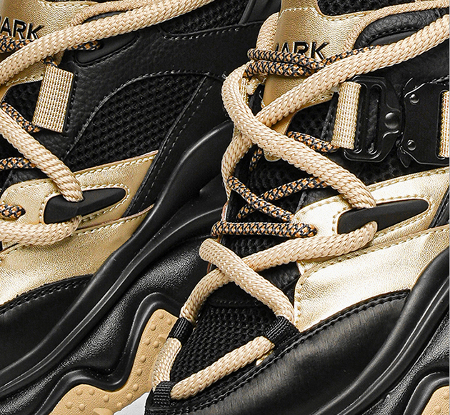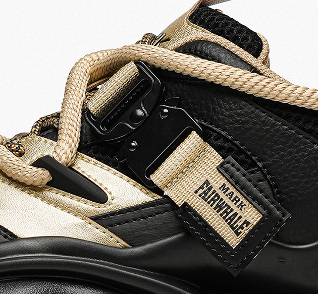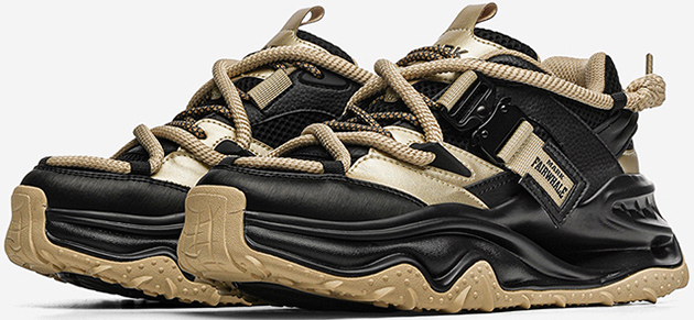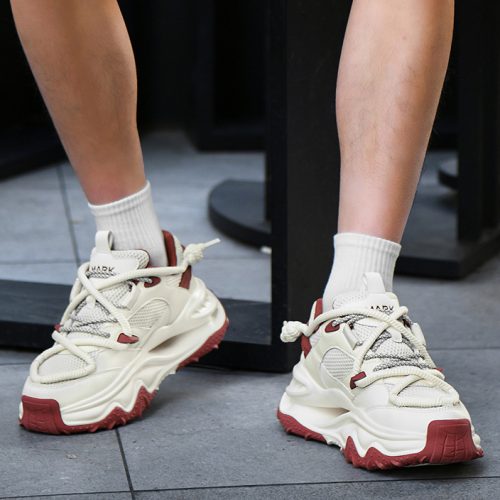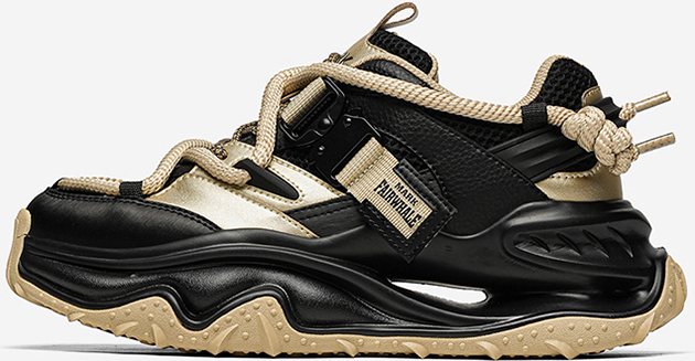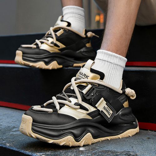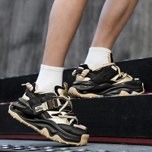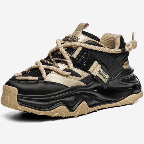 This chunky sneaker stands out with eye-catching color-blocking (black-gold, beige-red), pairing breathable comfort with edgy design—ideal for daily wear and street-style scenes.