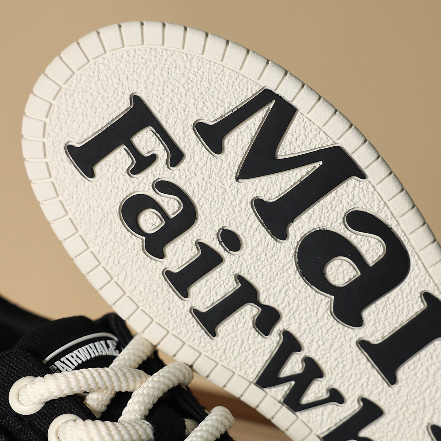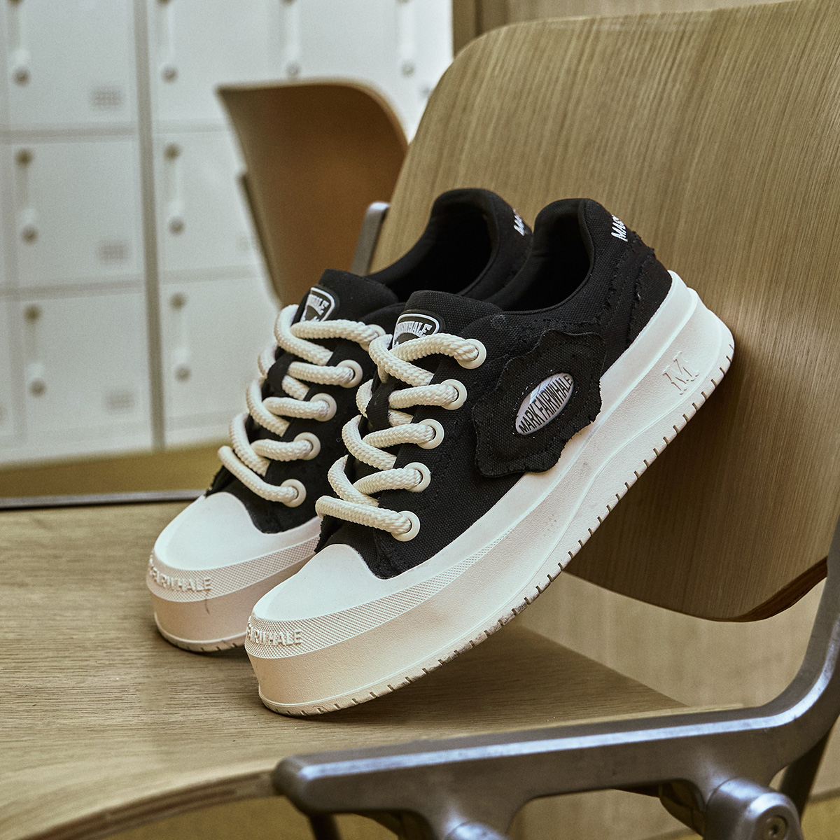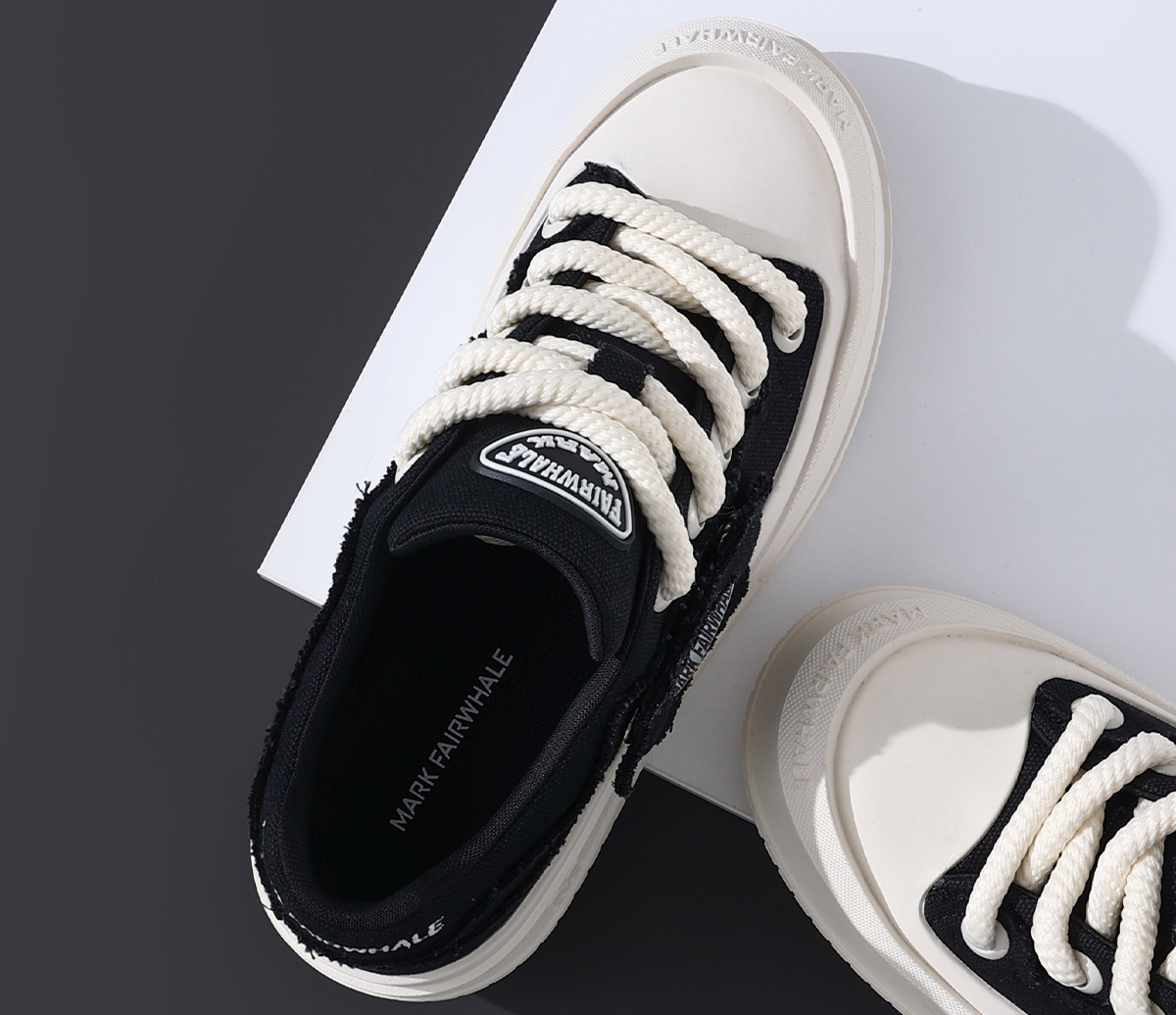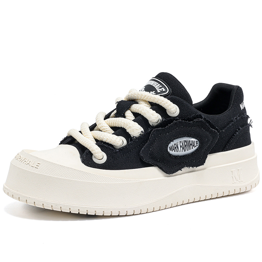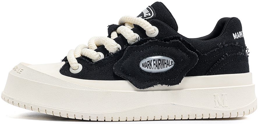 Black and white design perfectly complements everyday outfits, and the vintage-chic style makes these sneakers effortlessly stand out. The distressed canvas upper (with frayed edges) and removable brand patch add a playful texture, while the breathable fabric ensures all-day comfort. Striking brand logo details (on the sole, toe, and sides) reinforce brand recognition, making these shoes stylish yet understated – ideal for casual street style or everyday wear.