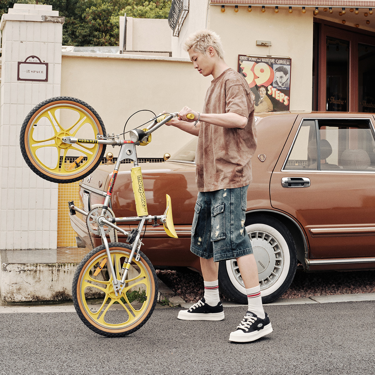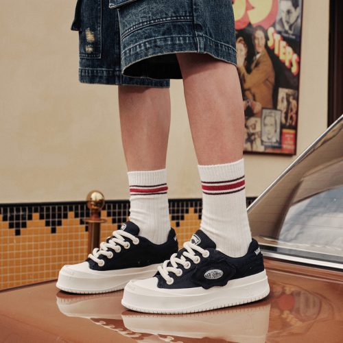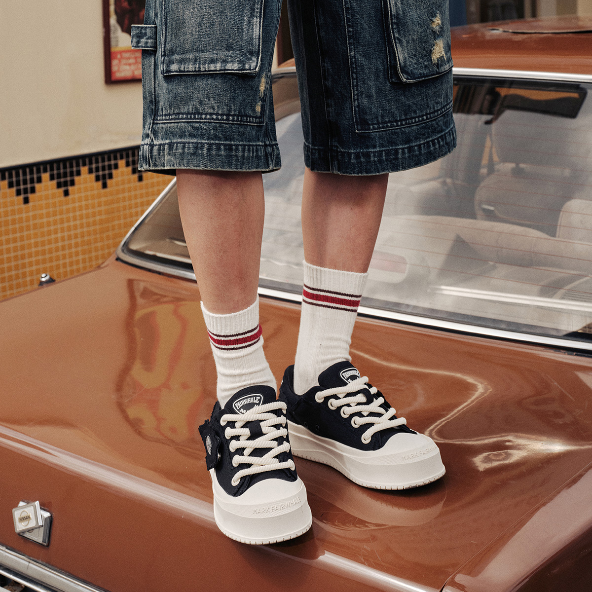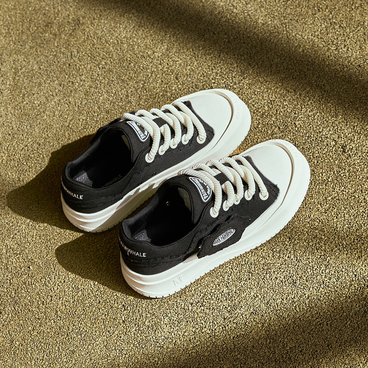 Black and white design perfectly complements everyday outfits, and the vintage-chic style makes these sneakers effortlessly stand out. The distressed canvas upper (with frayed edges) and removable brand patch add a playful texture, while the breathable fabric ensures all-day comfort. Striking brand logo details (on the sole, toe, and sides) reinforce brand recognition, making these shoes stylish yet understated – ideal for casual street style or everyday wear.