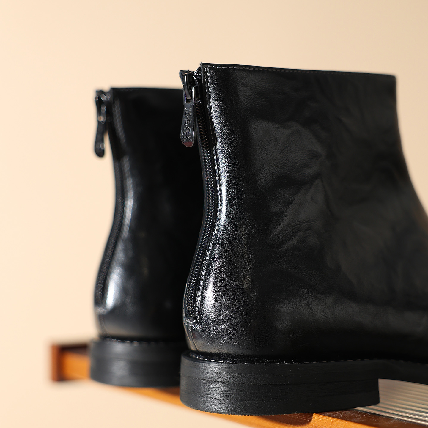 - The back zipper design allows for easy on and off while maintaining the clean lines of the boot’s sides.