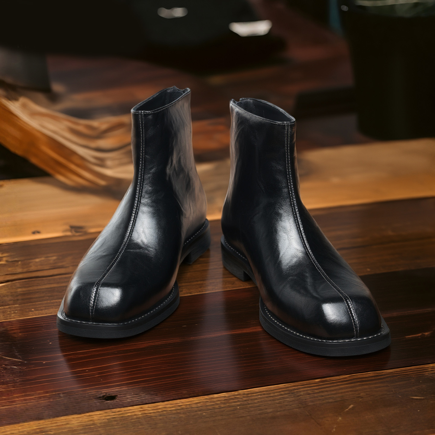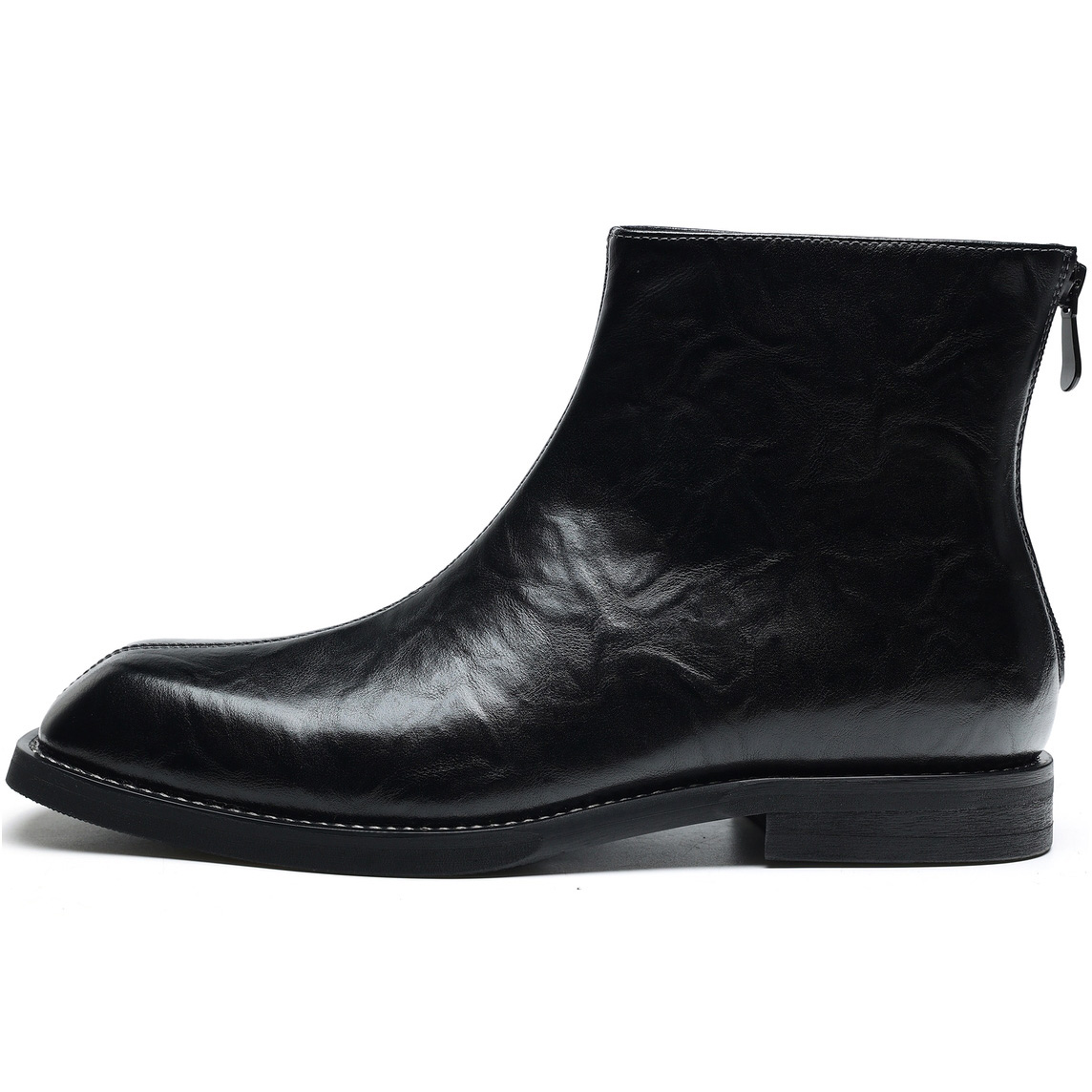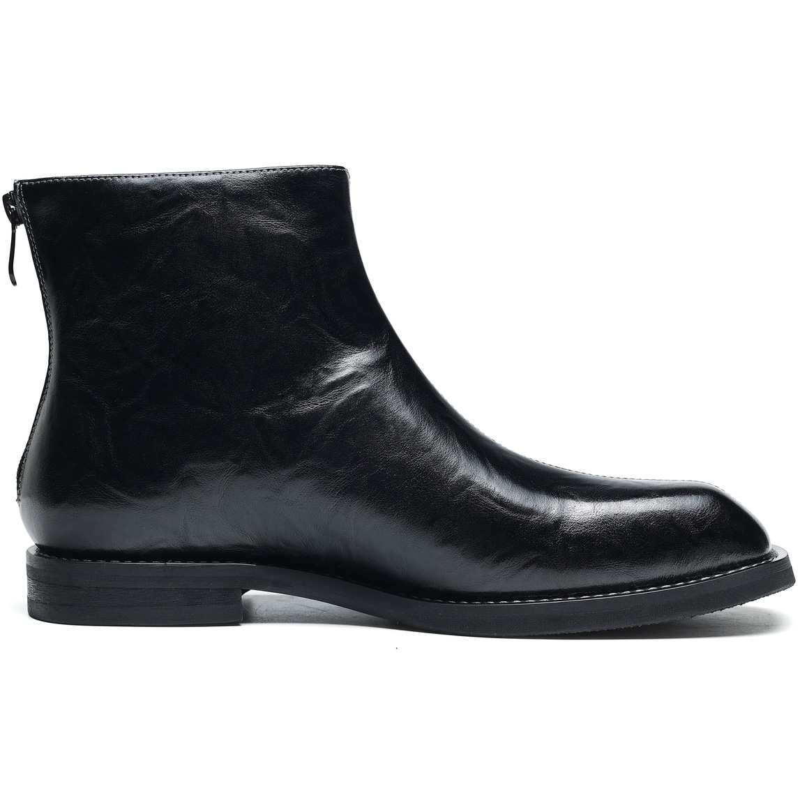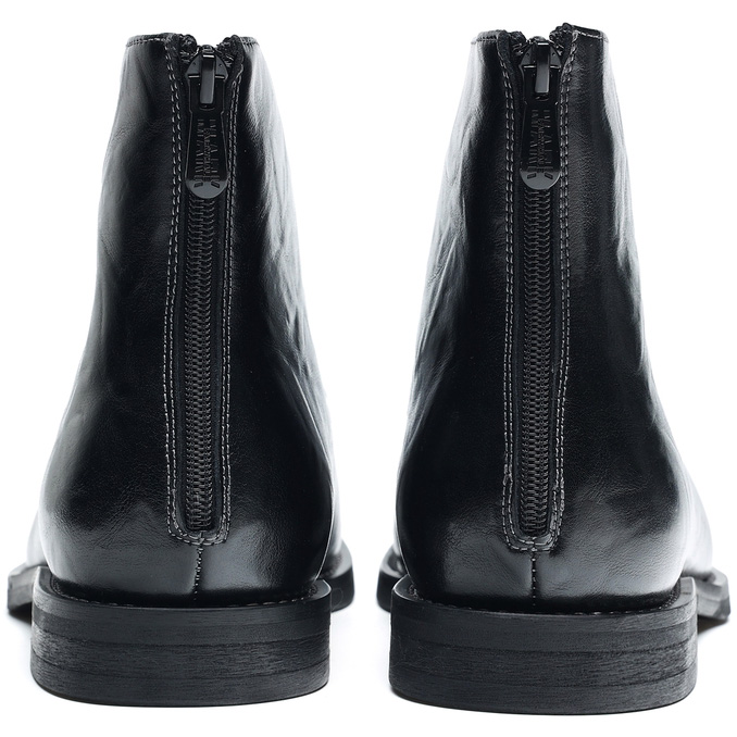This black glossy leather ankle boot features a rear zipper design, keeping the side lines of the upper clean and sleek. Paired with a square toe shape, it balances minimalism with refined sophistication.