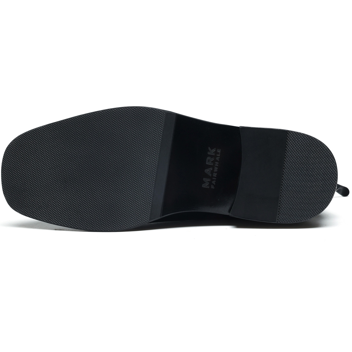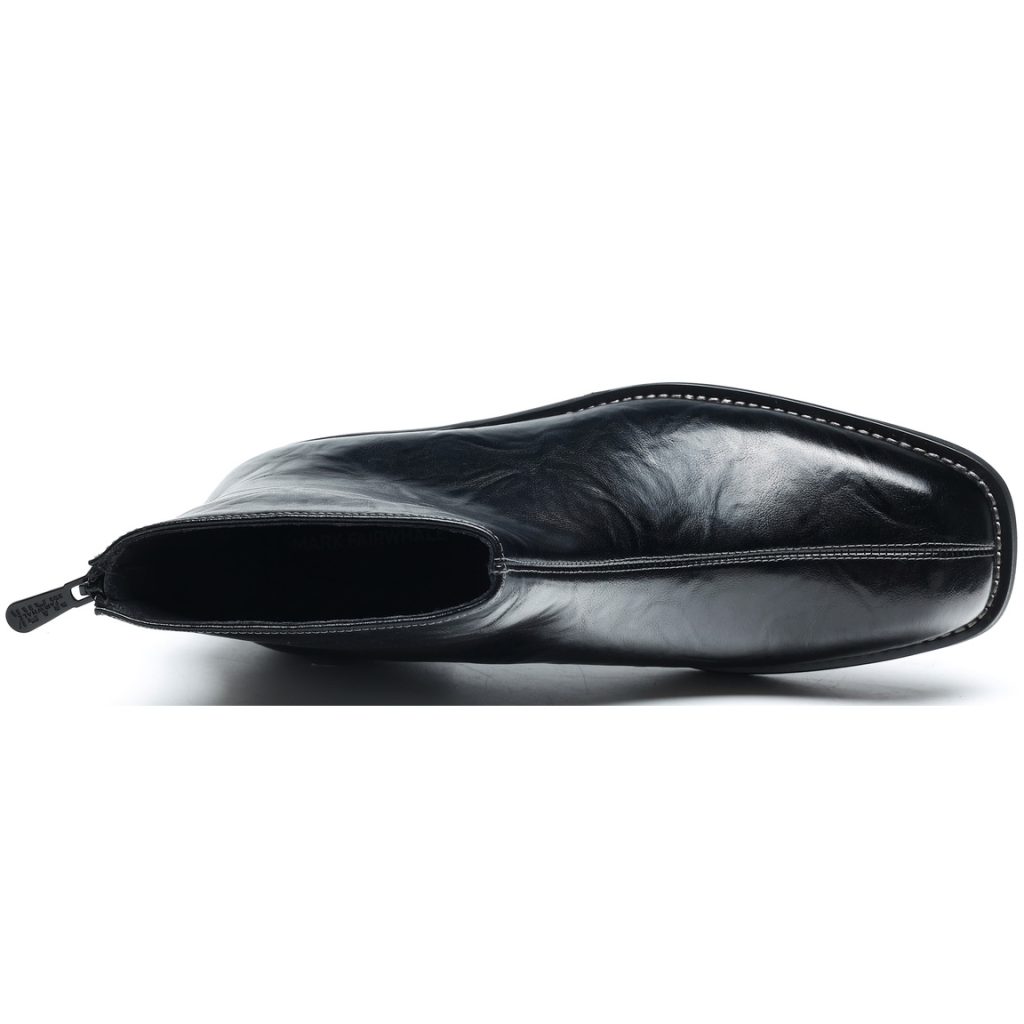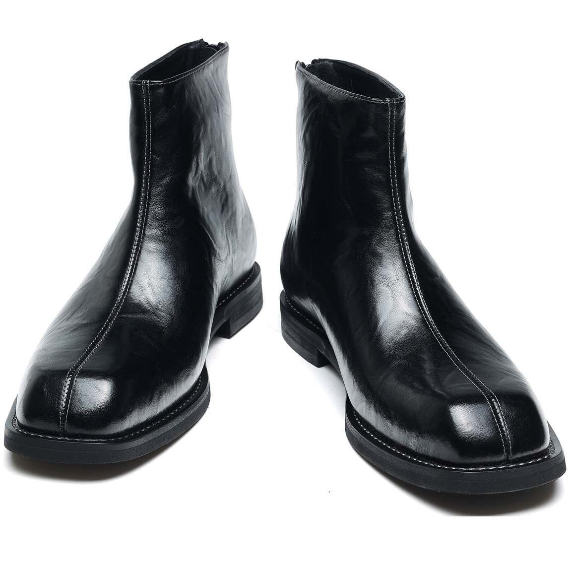 This black glossy leather ankle boot features a rear zipper design, keeping the side lines of the upper clean and sleek. Paired with a square toe shape, it balances minimalism with refined sophistication.
