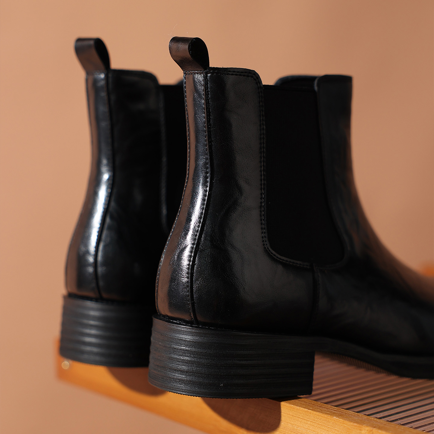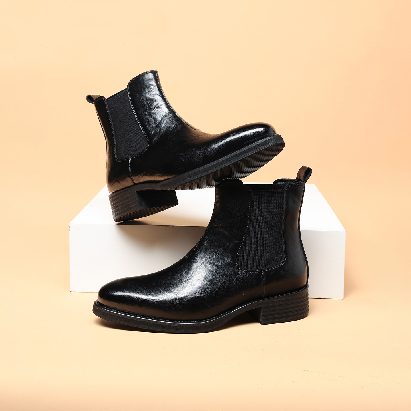 This is a pair of men’s black pointed-toe genuine leather chelsea boots, featuring smooth genuine leather, the style’s signature elastic side panels and heel pull tab for easy slip-on wear, paired with a non-slip textured sole, offering a sleek and sophisticated look with practical functionality.