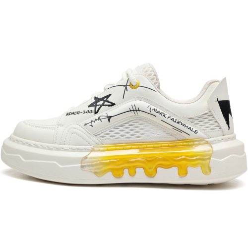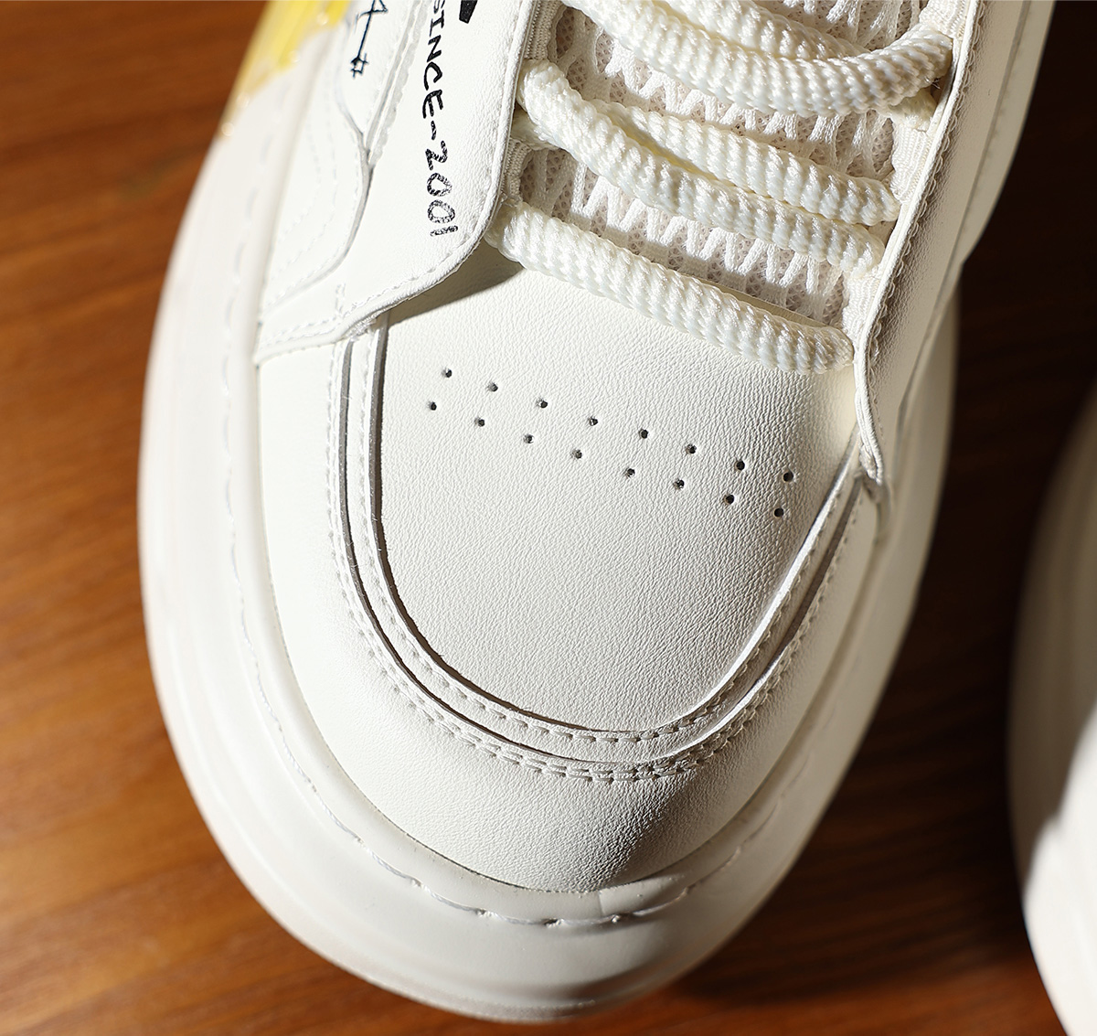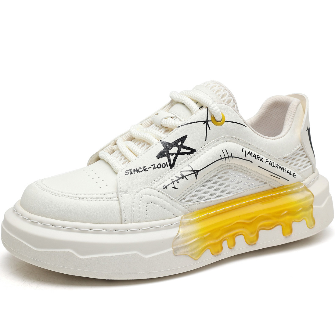 If so, this one may be your type! Versatile white color for your everyday wear. Graffiti design stands out for your trendy taste. One gradient yellow drop glue sticker on the outside shoe heel brings a strong insight effect. Leather and mesh blocking ensures the stable shape and the breathability.