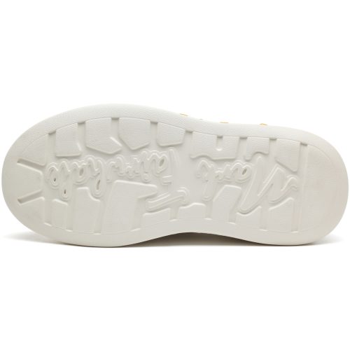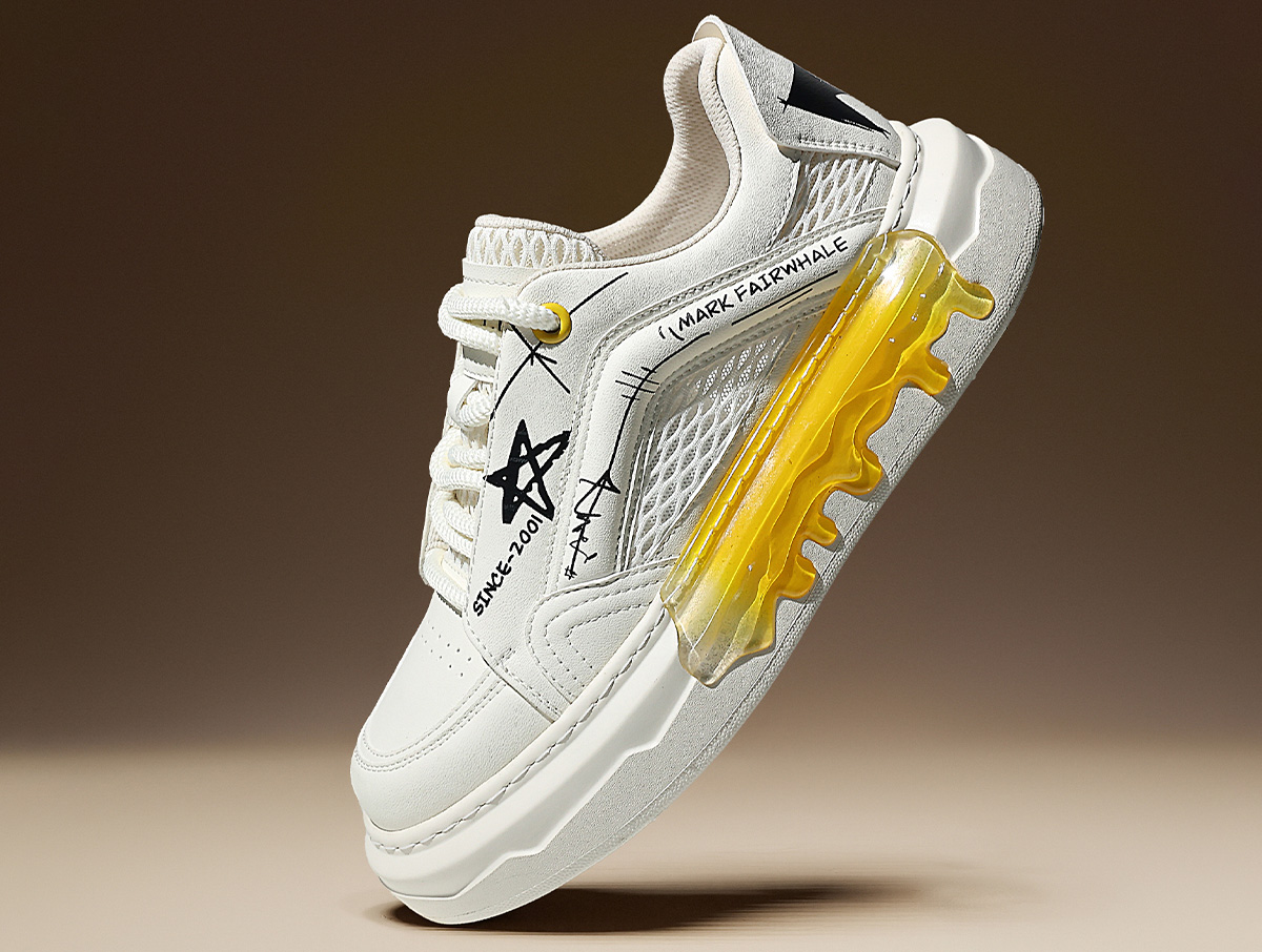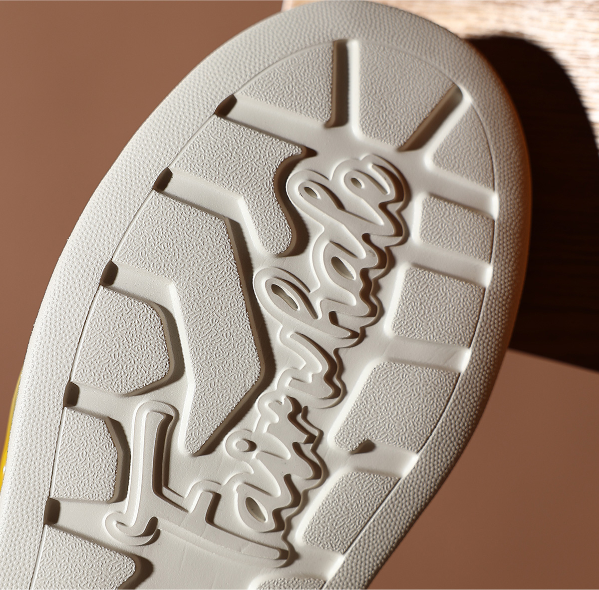 - The designed outsole is the main point. The yellow glue sticker is the most eye-catching part of the shoes, its status of flowing is the symbol of moving, chic, bright and creative, catching eyes totally.Â