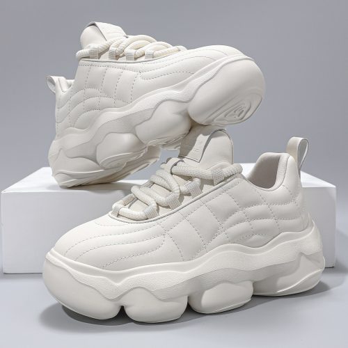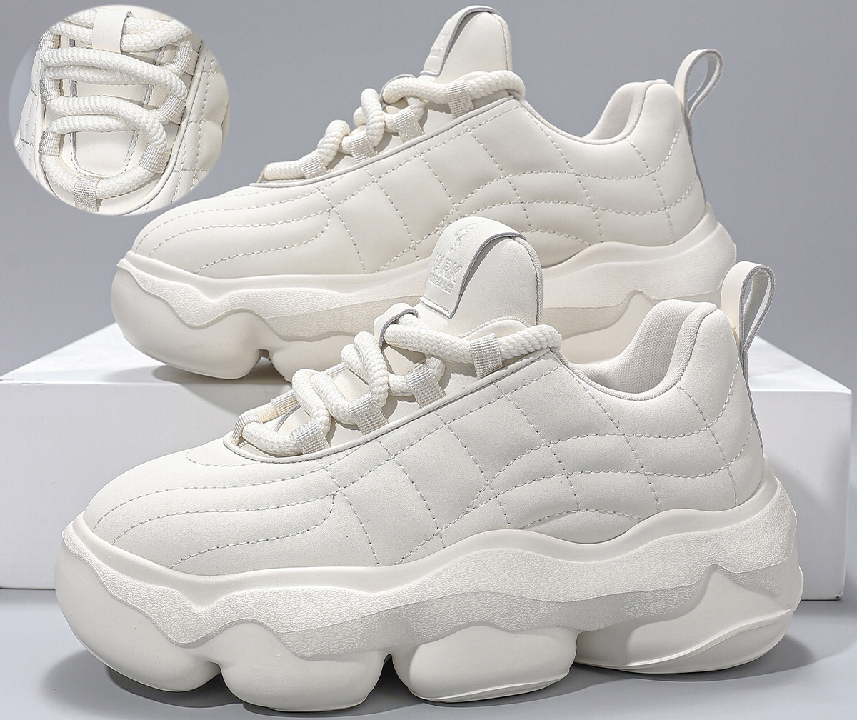 Creamy white rope-tie dad sneakers feature a minimalist solid color, rounded segmented chunky sole for cushioning and style, easy-on rope laces with heel pull tabs, and faux leather quilted upper for enhanced texture and fit!