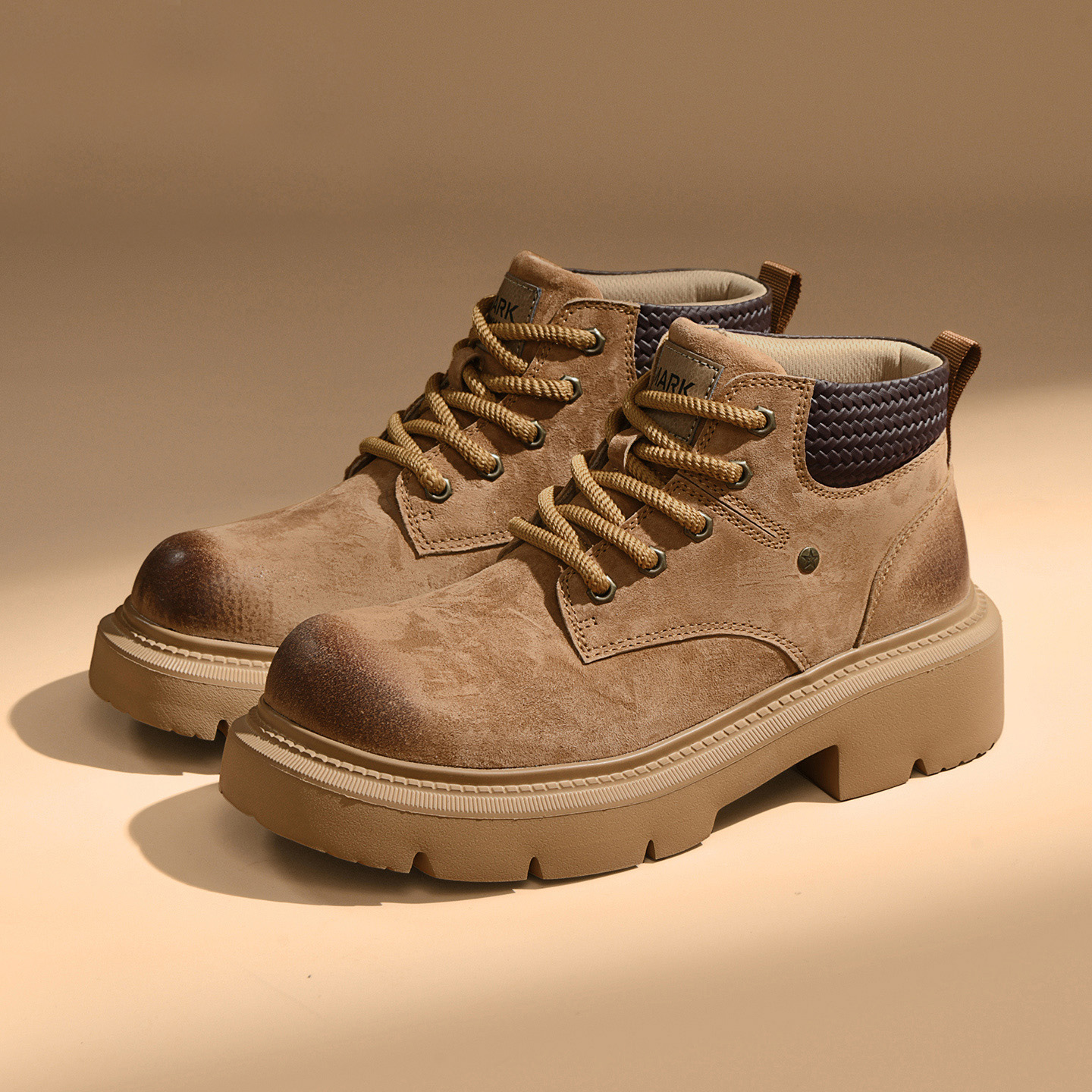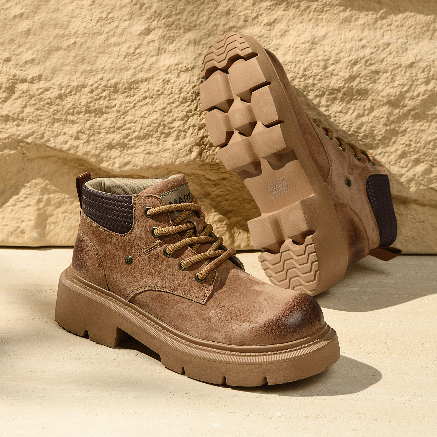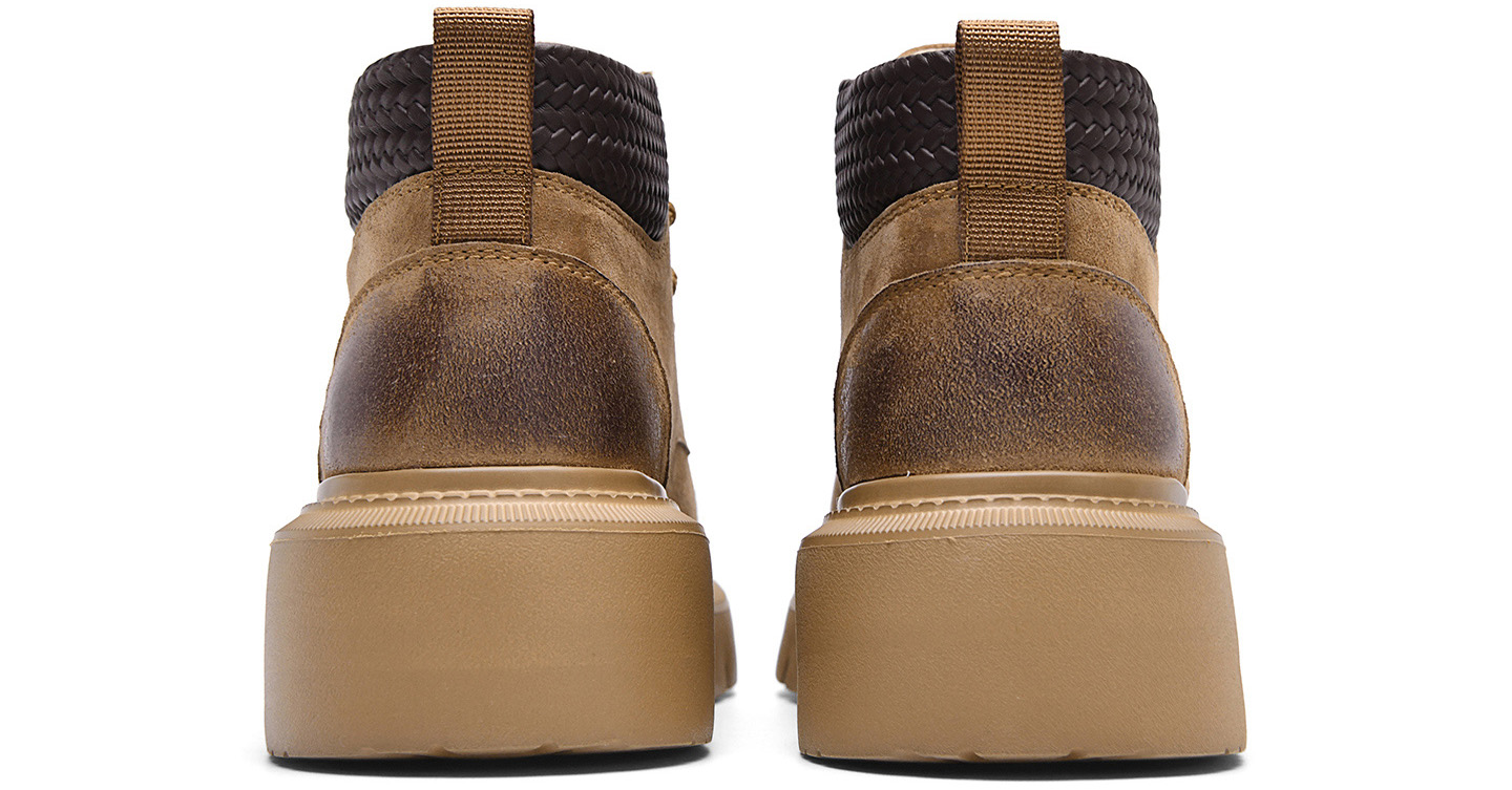 A pair of men’s distressed chunky-sole work boots with a woven textured collar, blending vintage ruggedness and modern comfort for versatile styling.