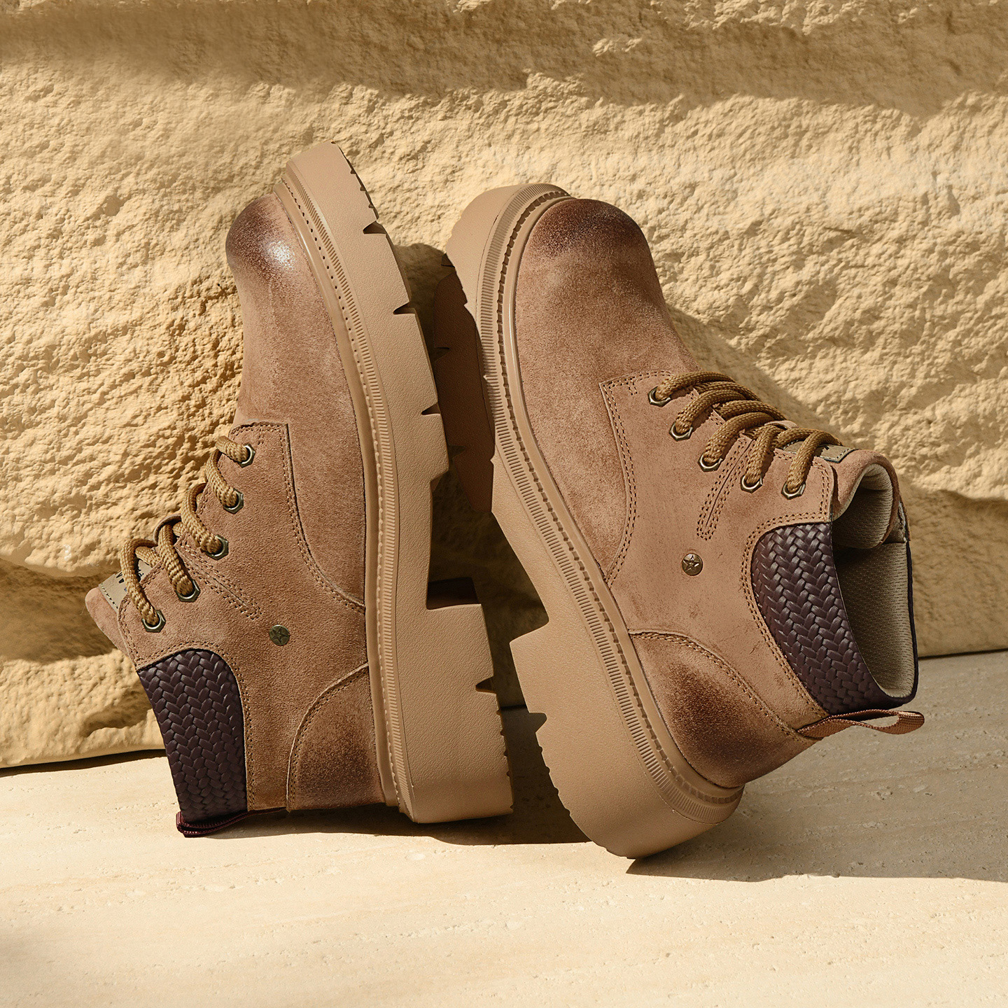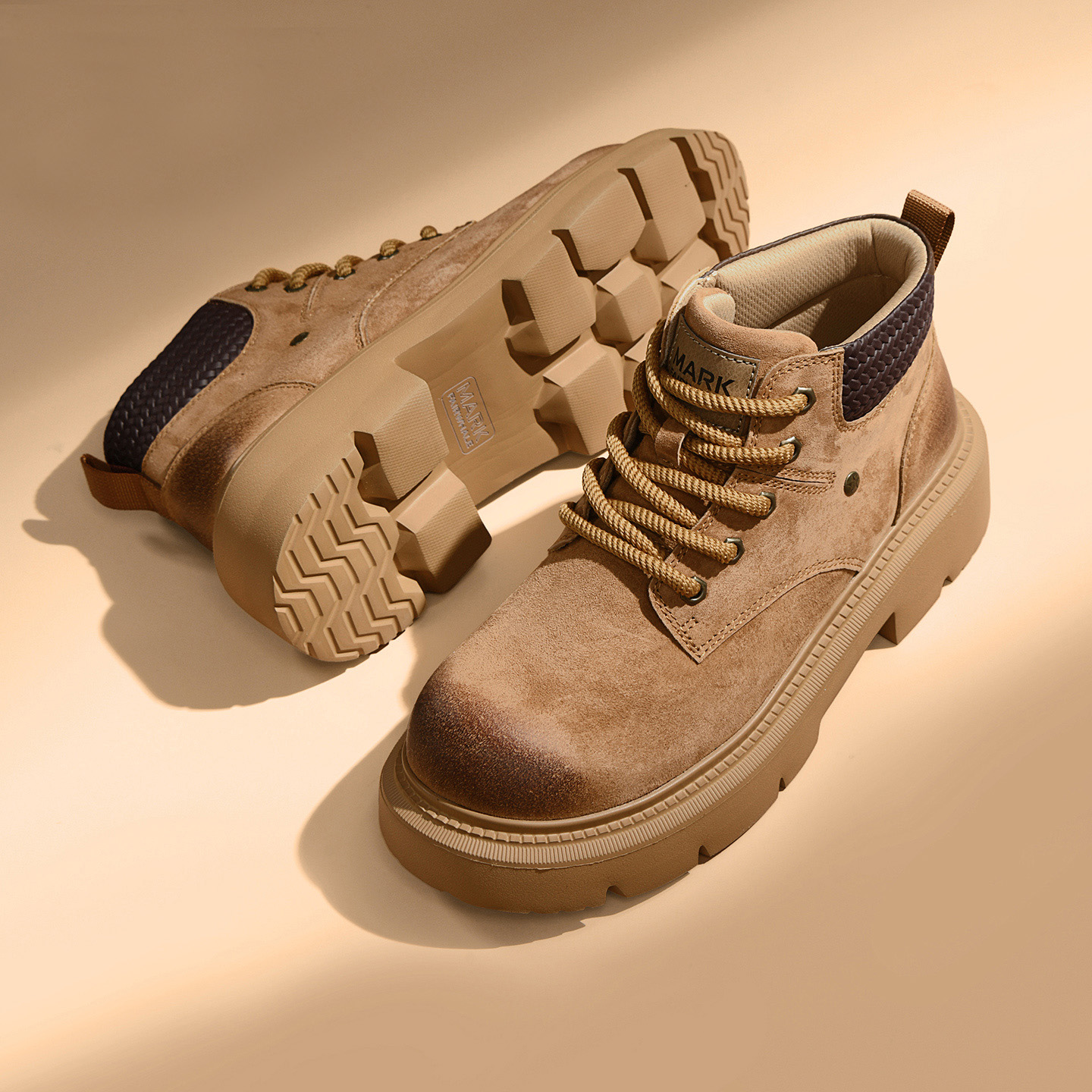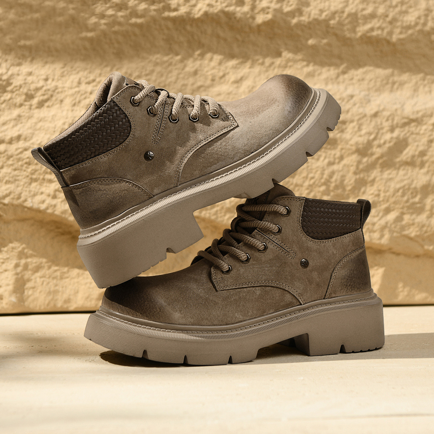 A pair of men’s distressed chunky-sole work boots with a woven textured collar, blending vintage ruggedness and modern comfort for versatile styling.