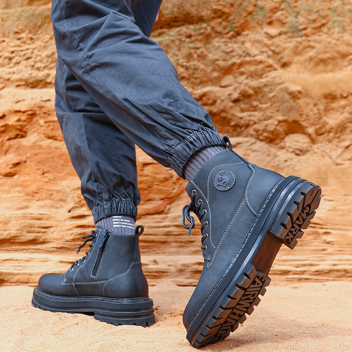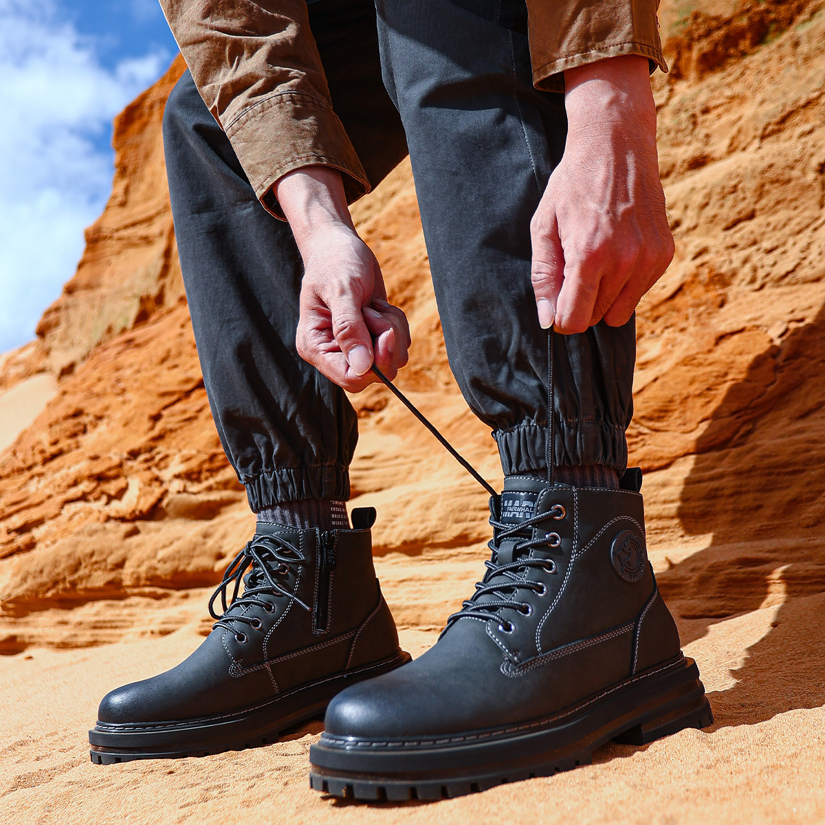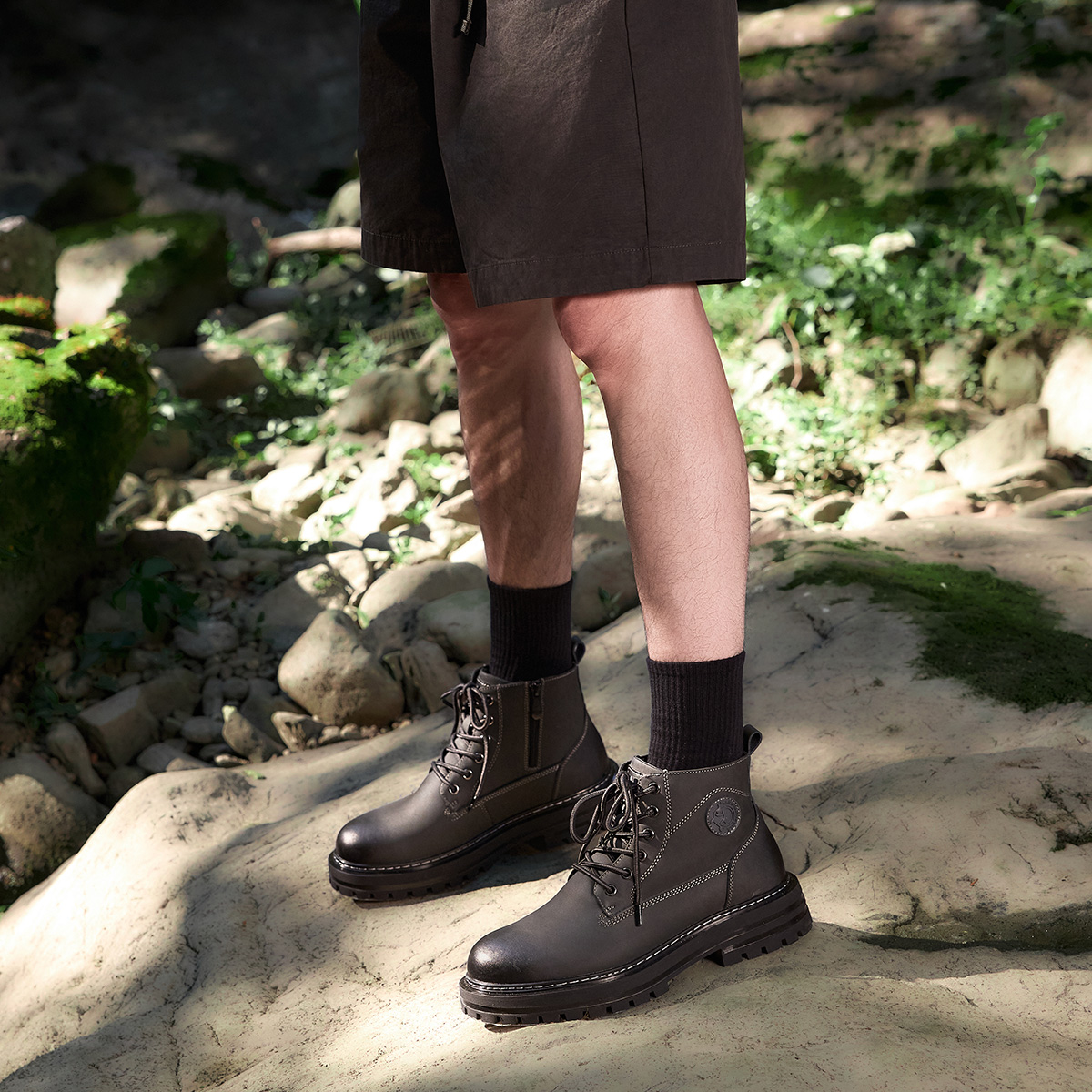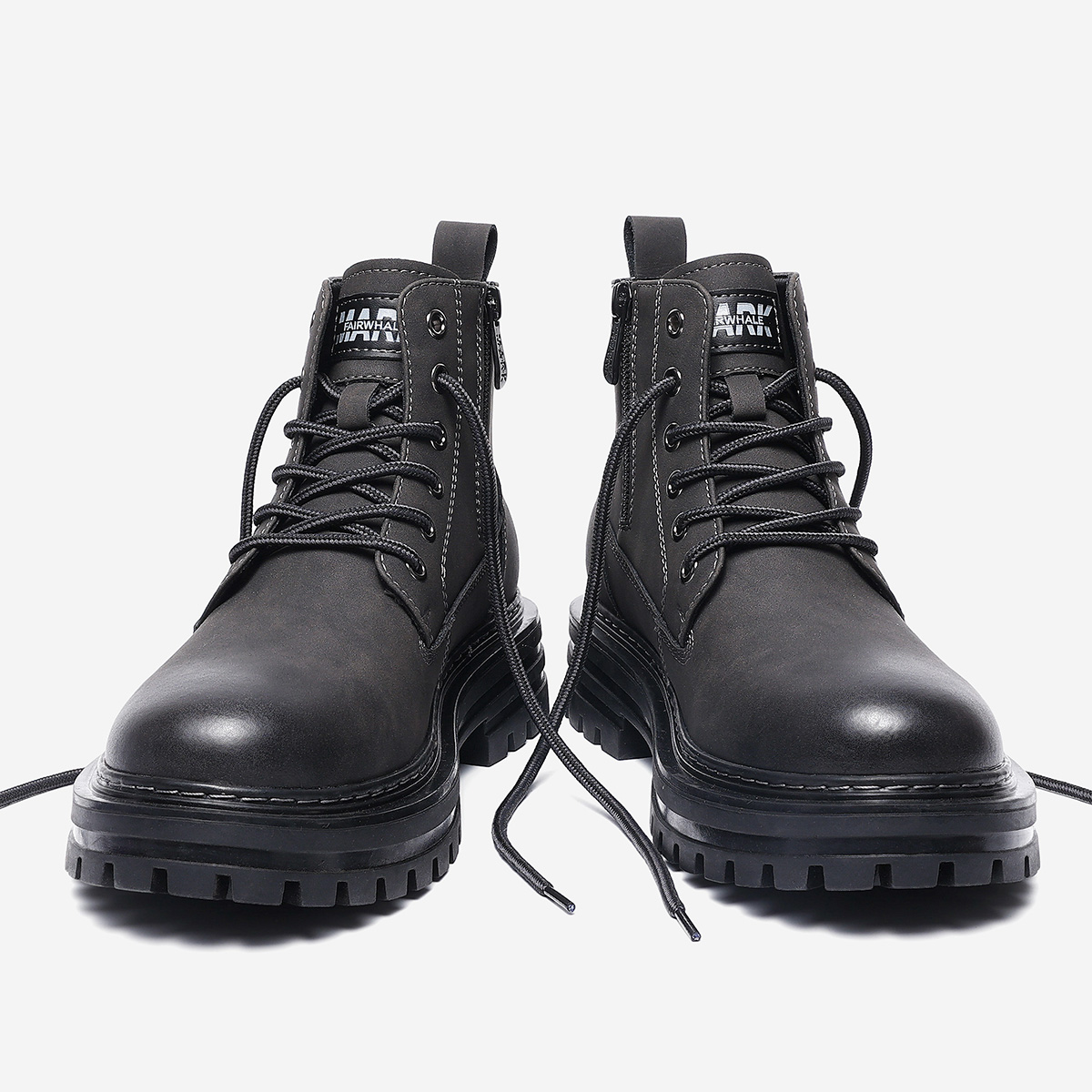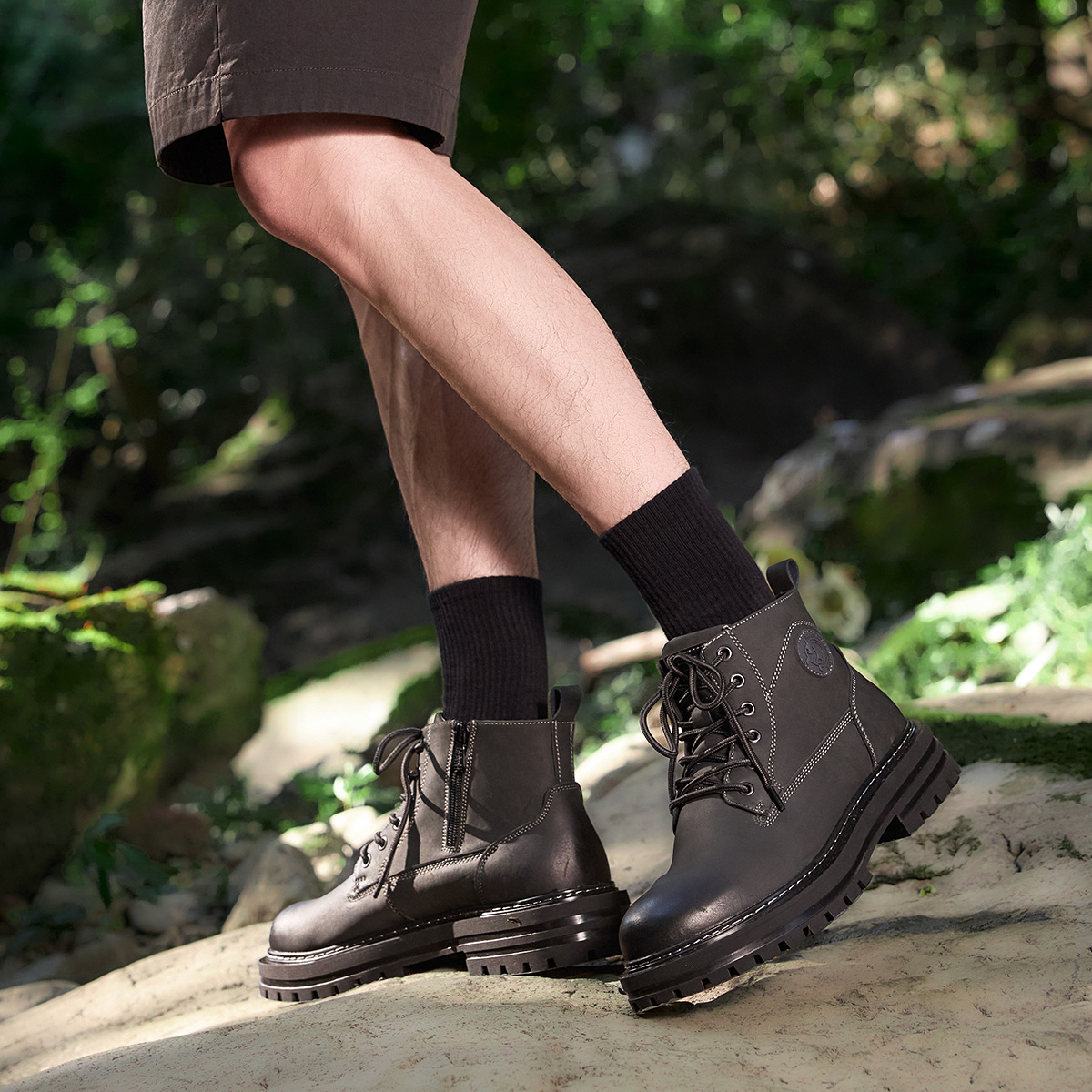 Mens Minimalist Lace Up 6 Eyelets Leather Boots with Side Zipper