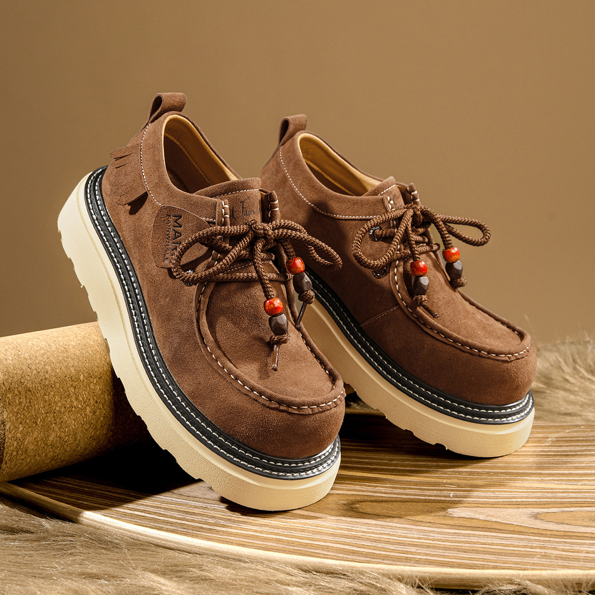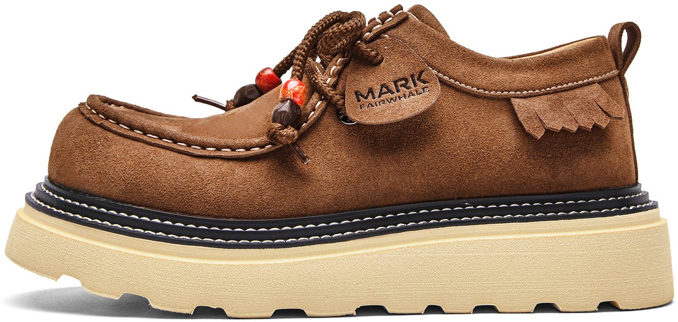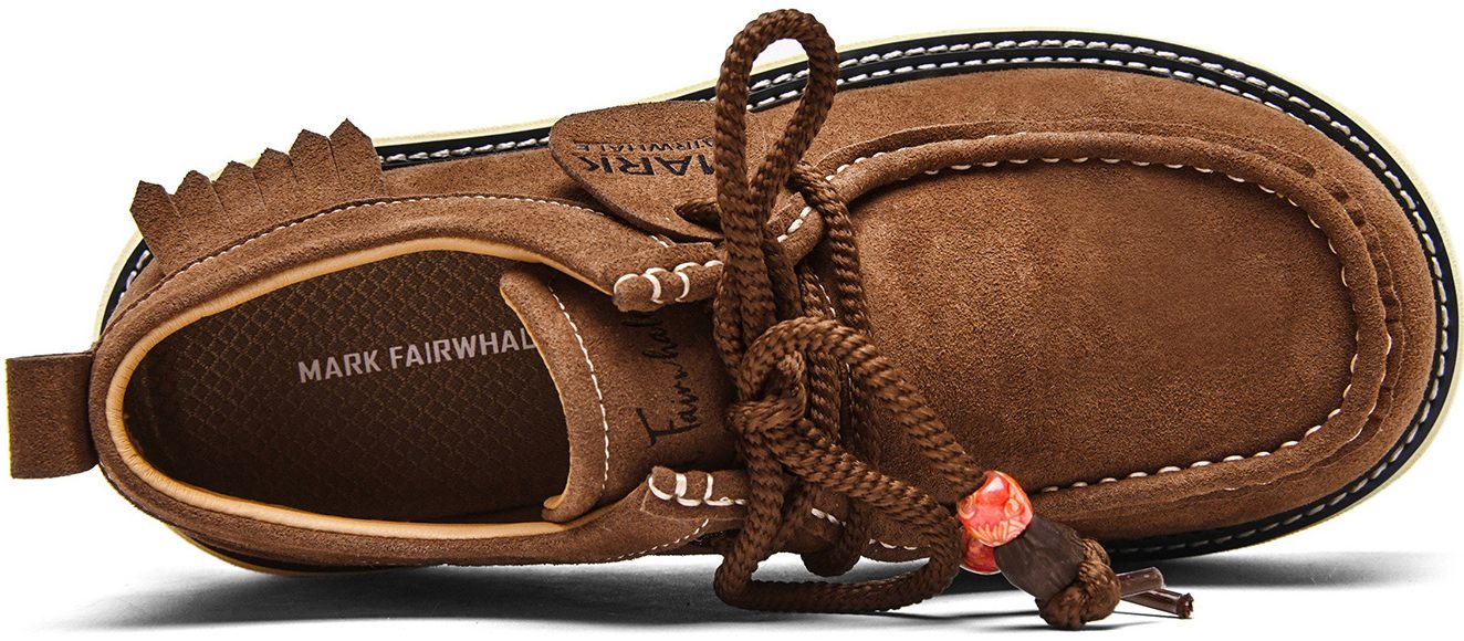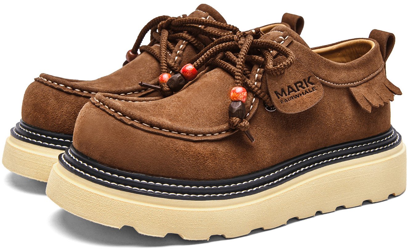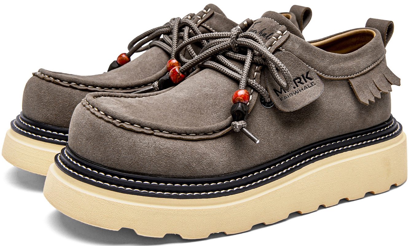 - Design: double stitching, moc toe, fringe trim, laces with porcelain beads.
