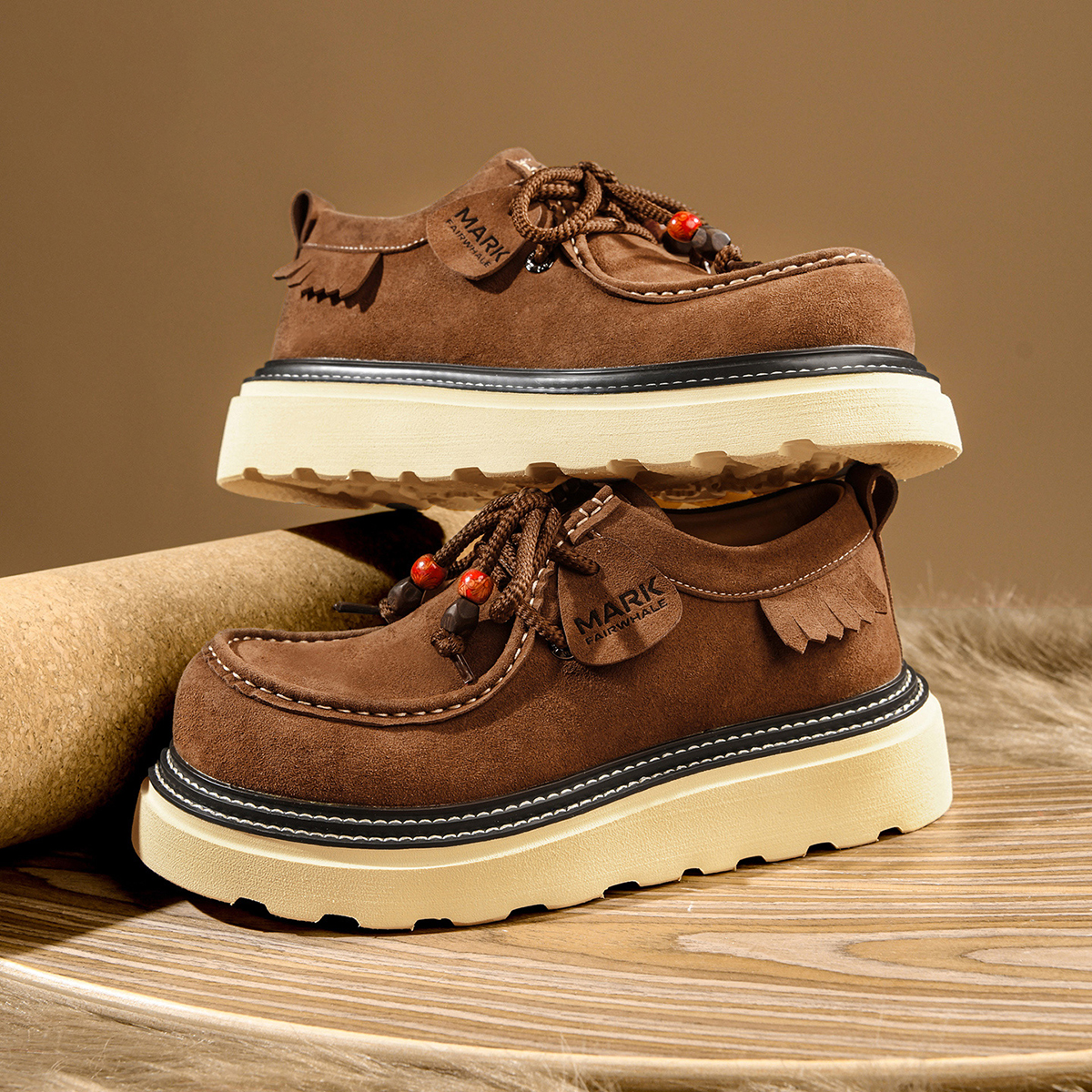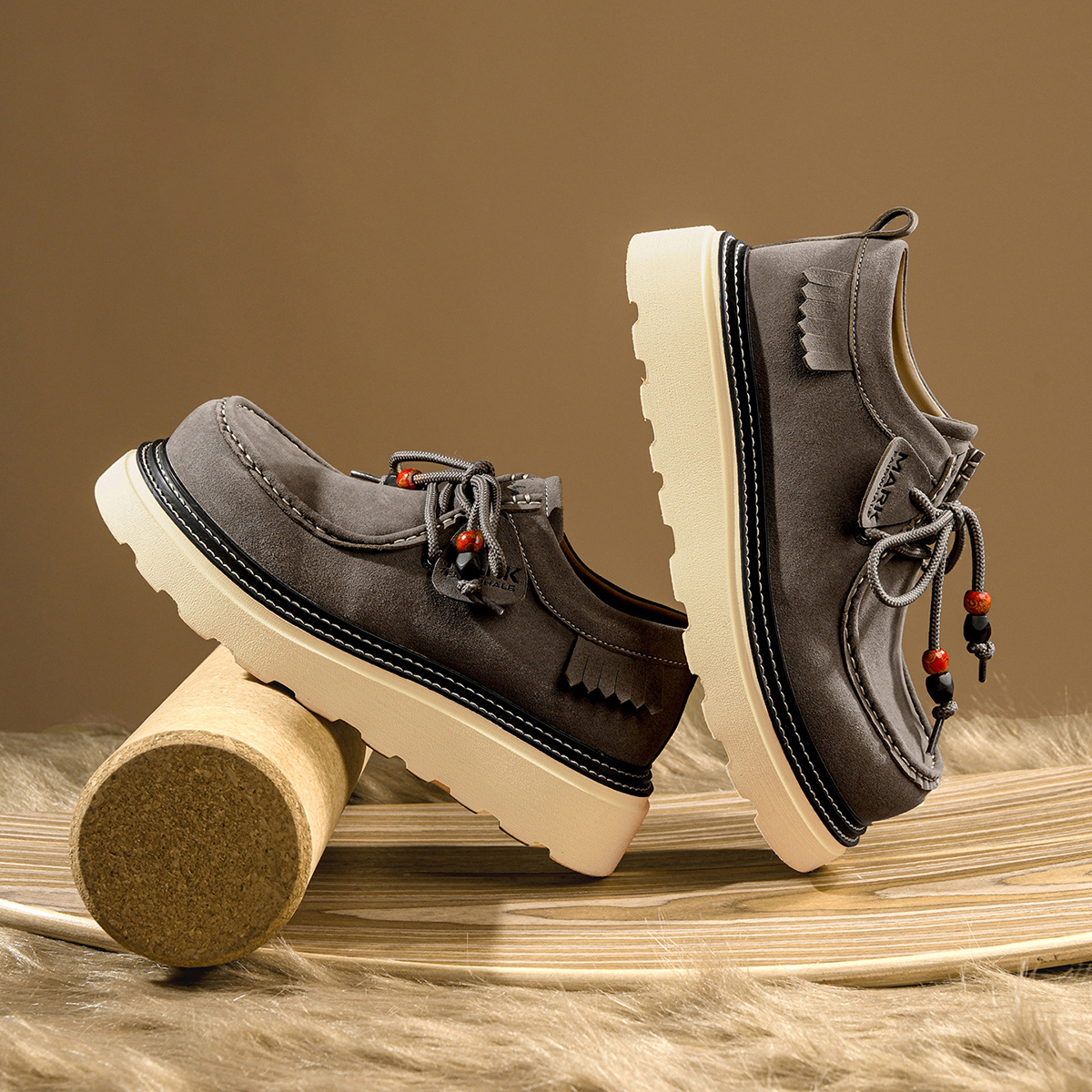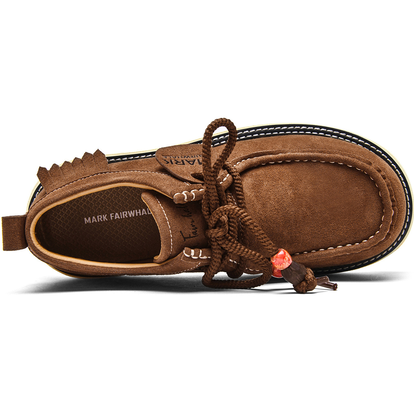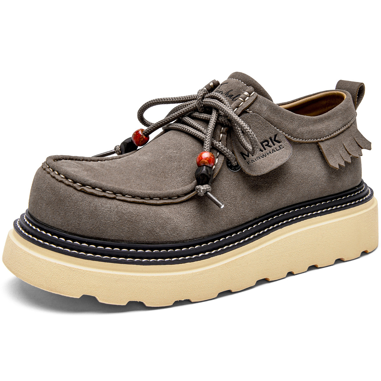 - Design: double stitching, moc toe, fringe trim, laces with porcelain beads.