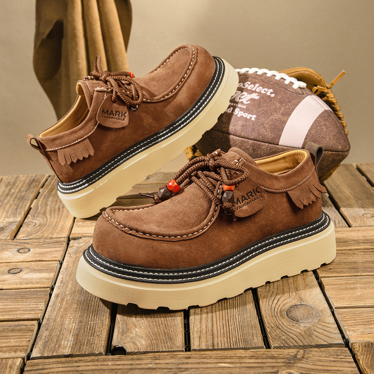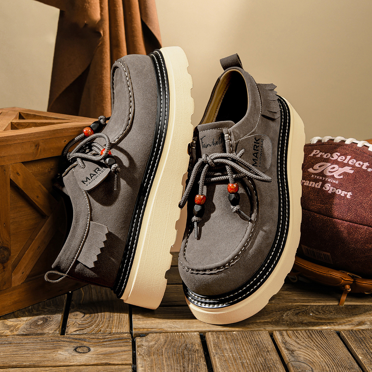 - Material: suede matte leather upper, EVA(rubber foaming) sole, textile insole, braided laces.