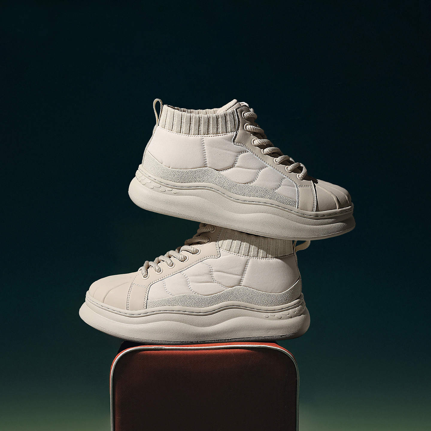 This men’s shell-toe chunky high-top skate shoe features a snug-fitting knit collar, combining the retro shell-toe design and chunky sole for both trendy style and easy, comfortable wear.
