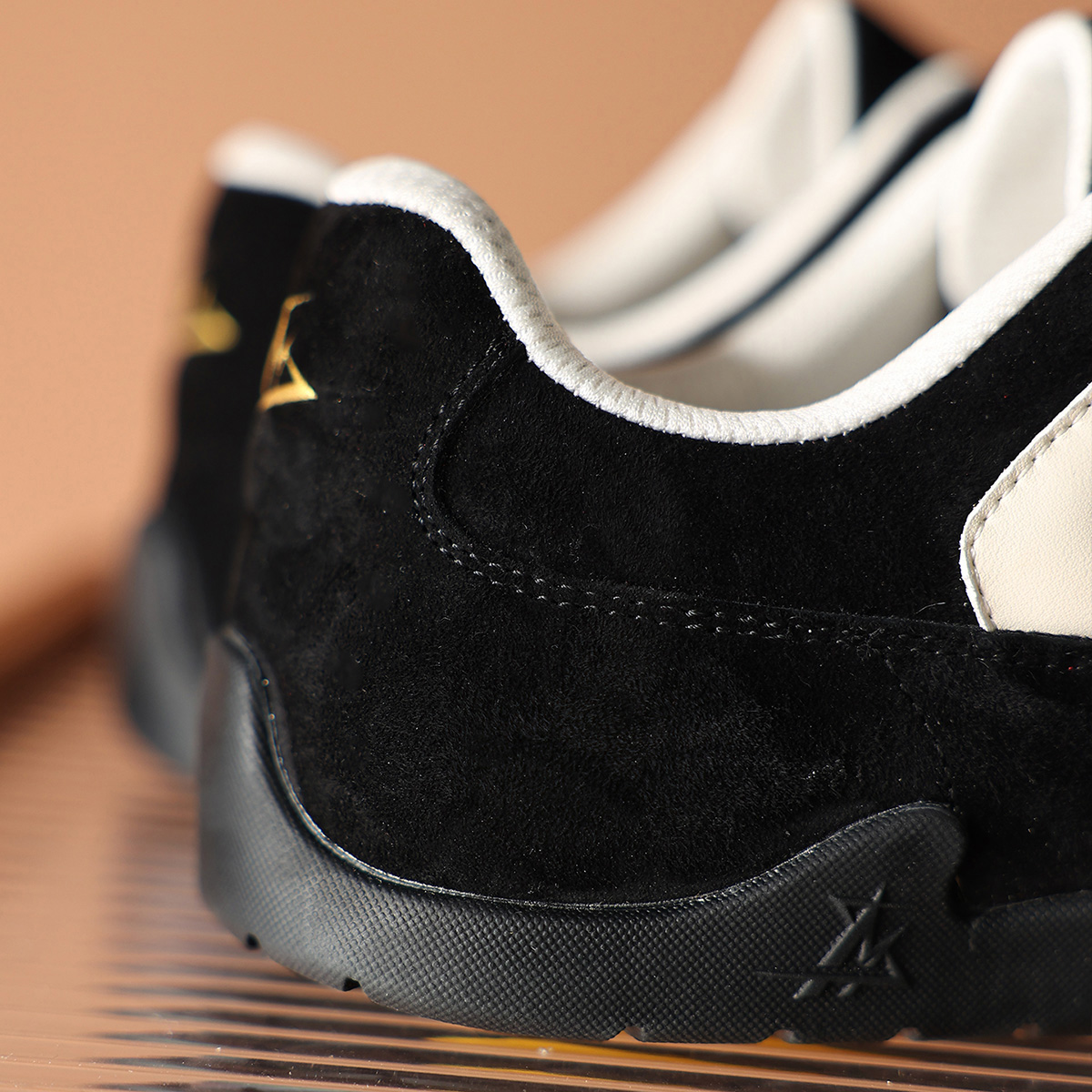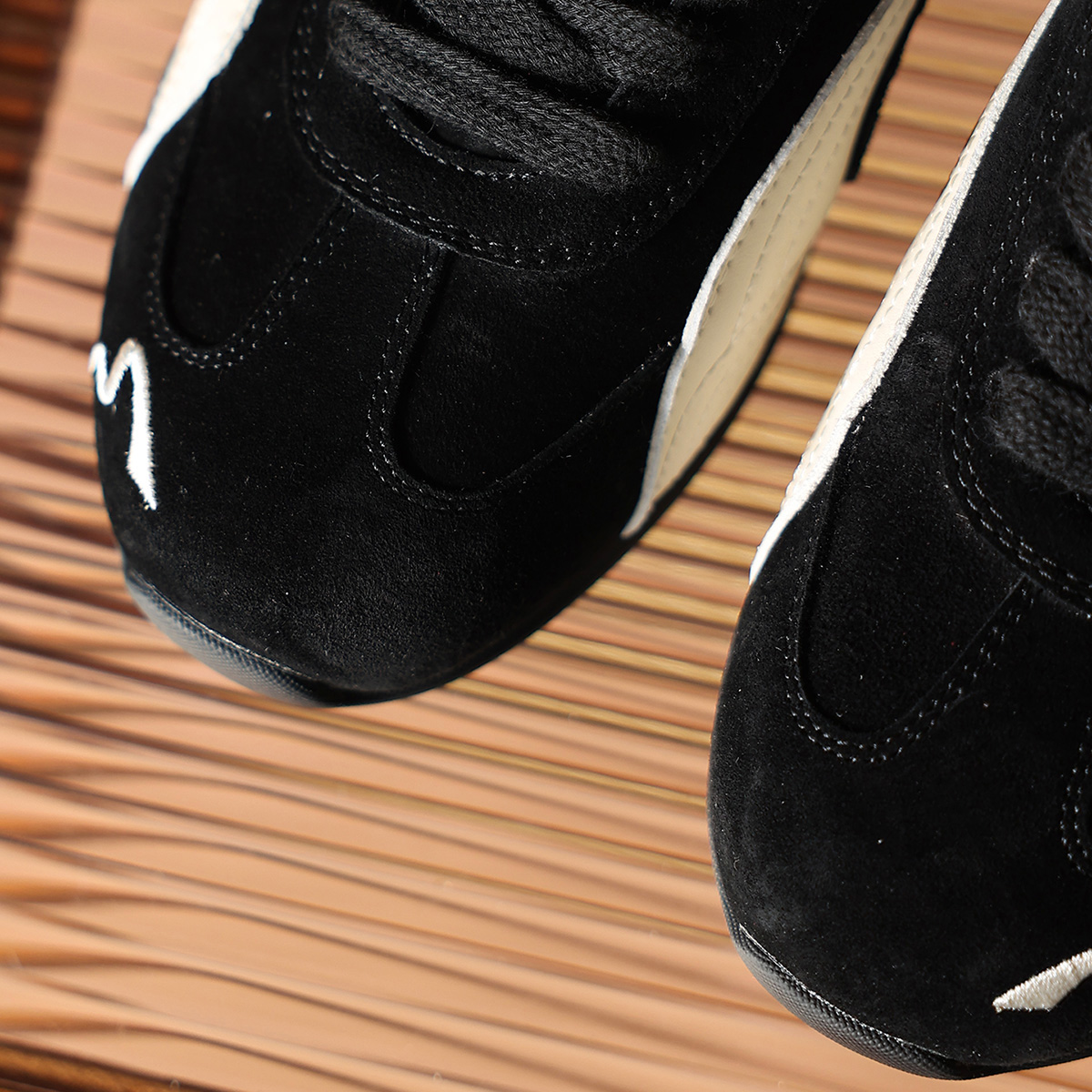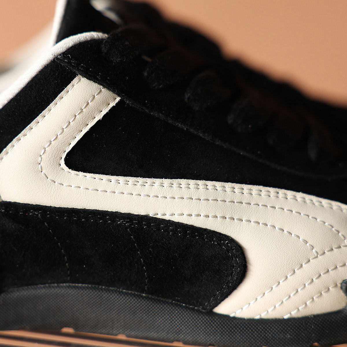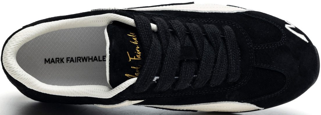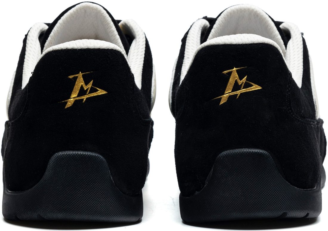 Mens Suede Black German Army Trainers with White Streamlined Overlays and Embroidery