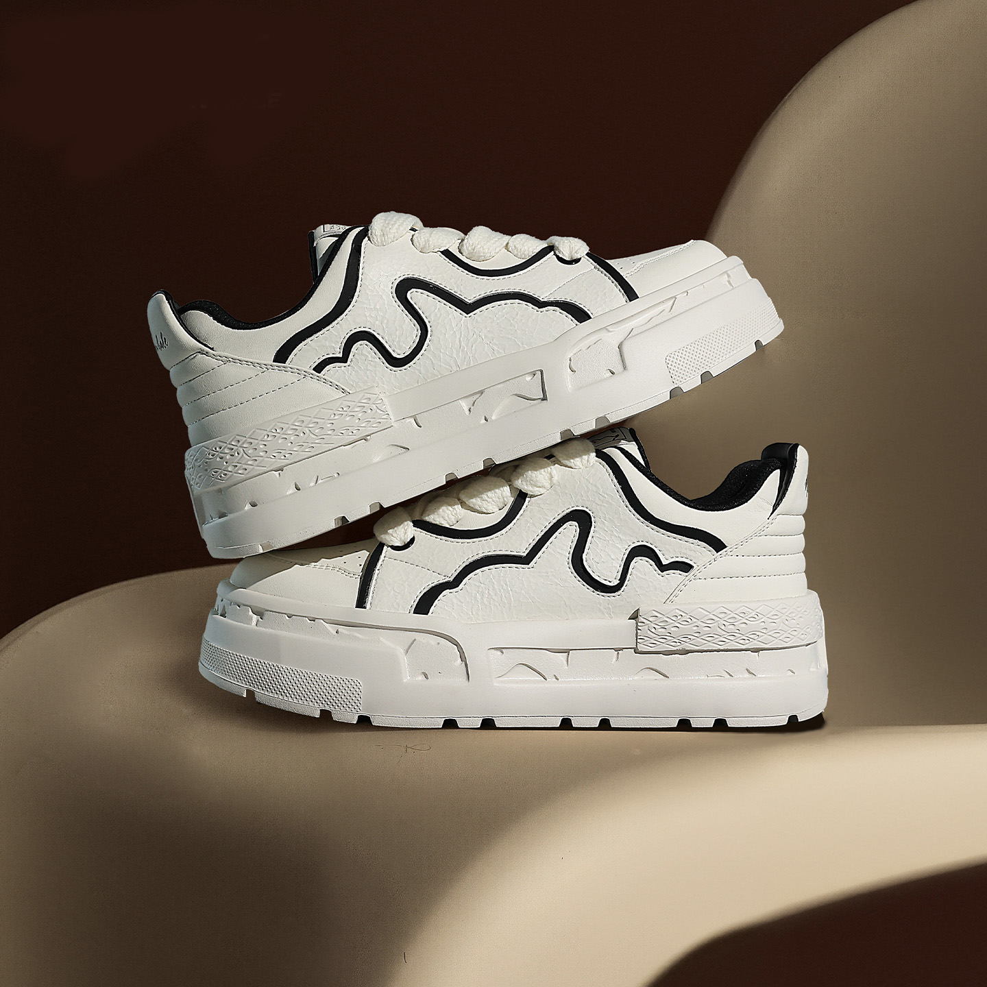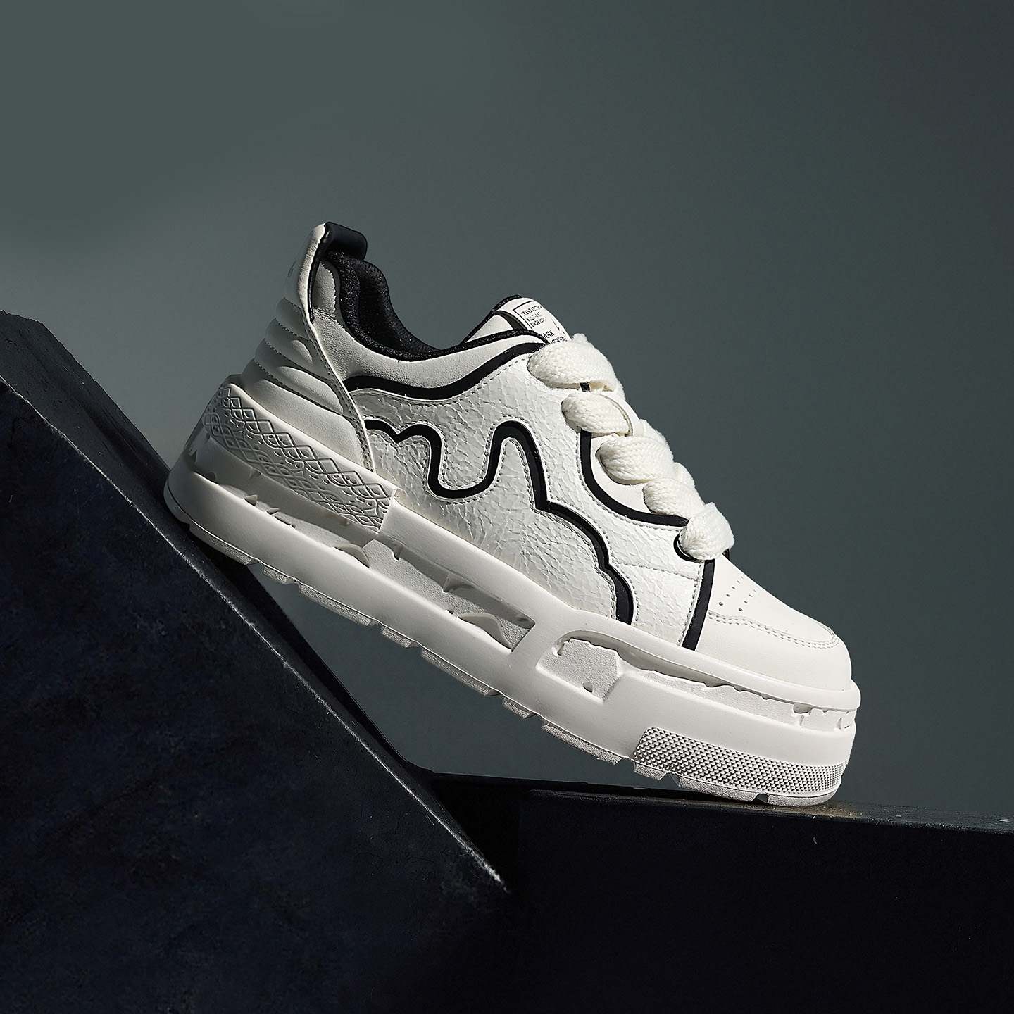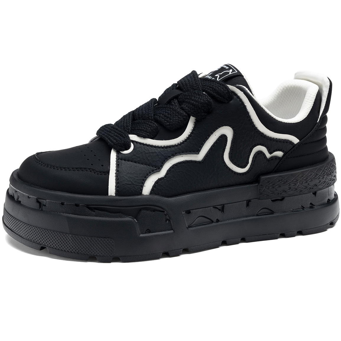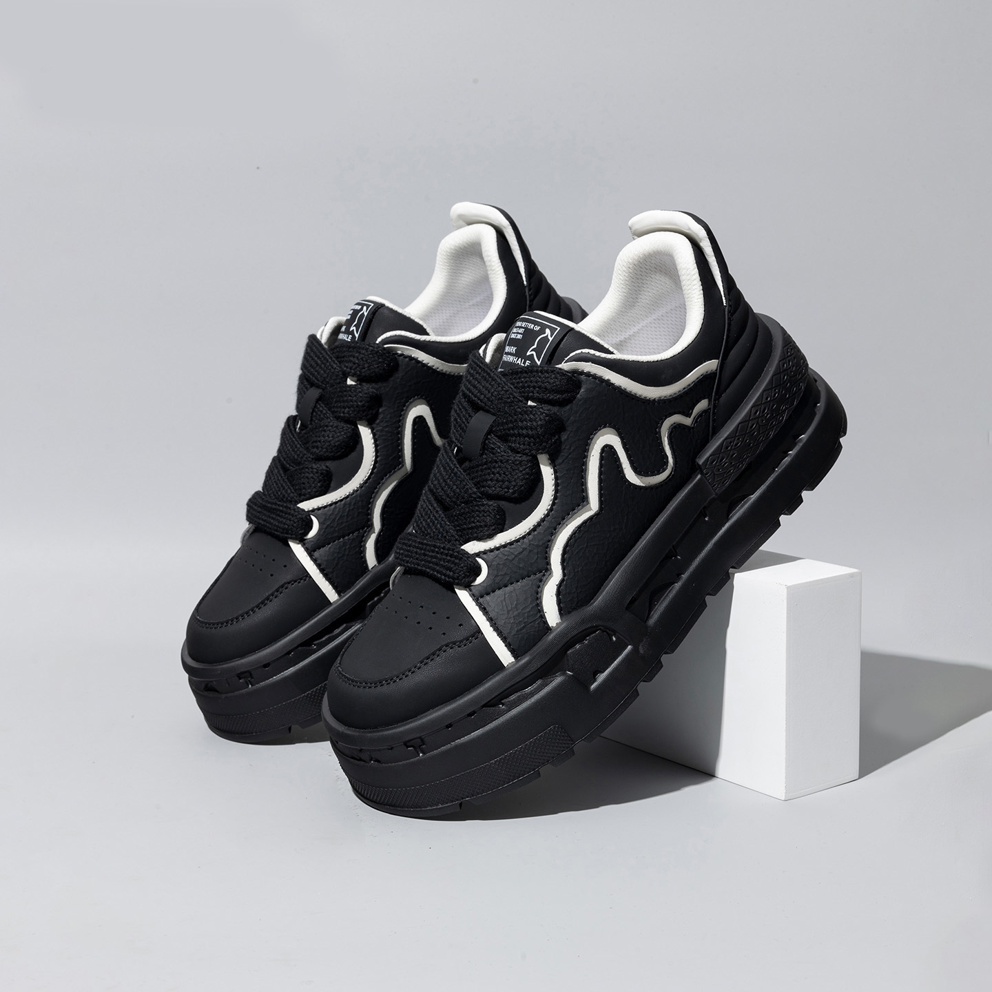 This shoe is available in black and white, featuring wave-patterned panel details and a textured thick sole, with a minimalist silhouette that exudes sleek design flair.