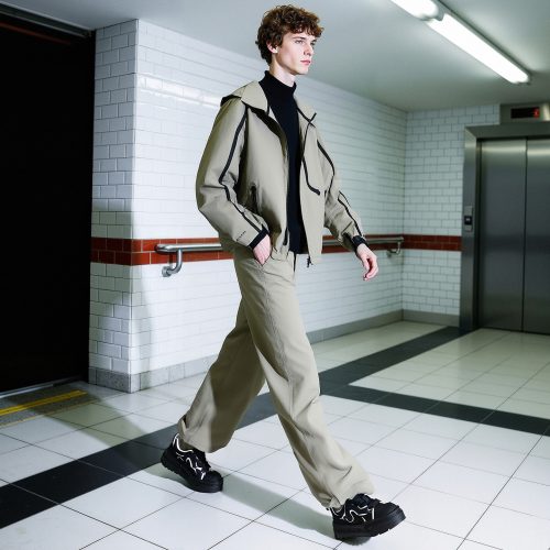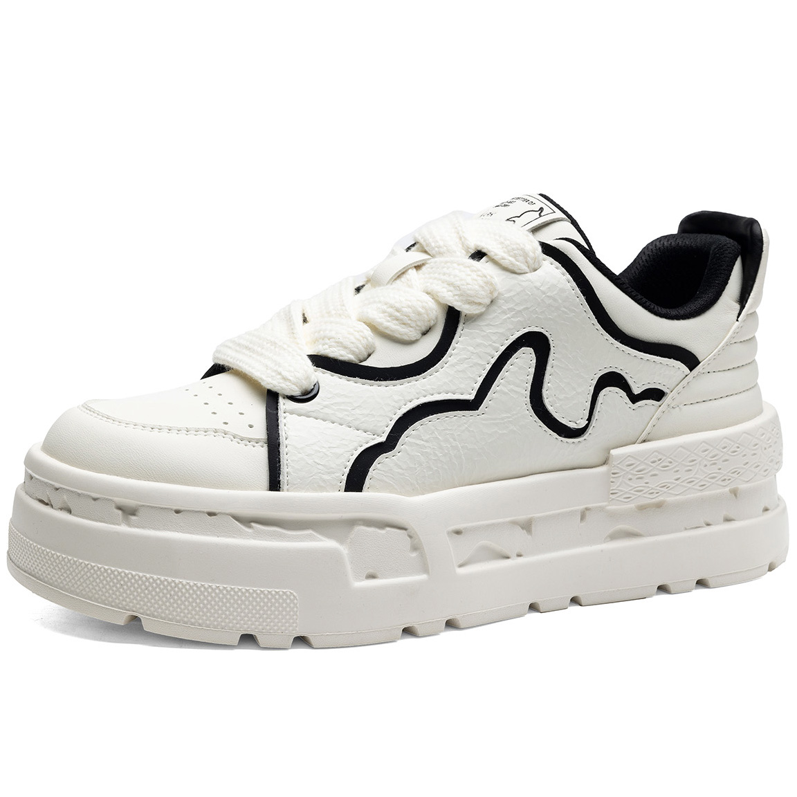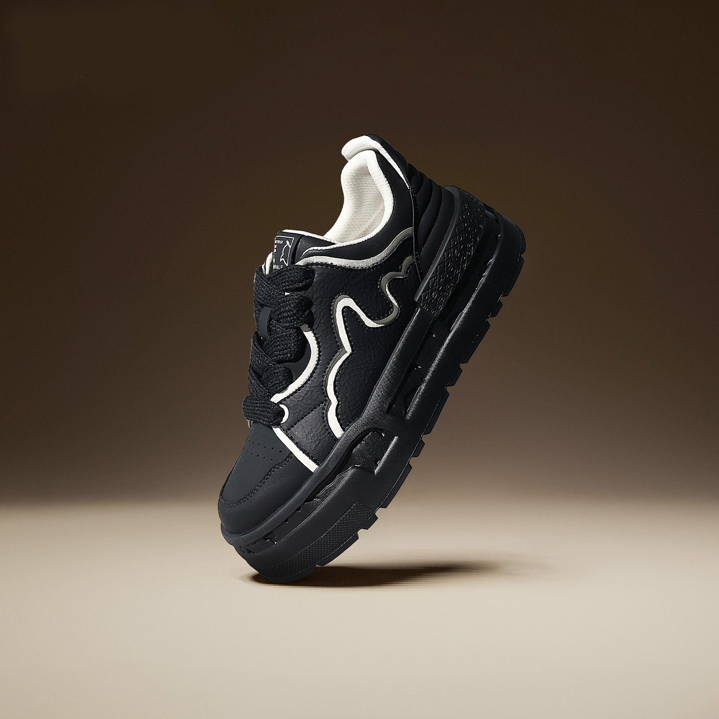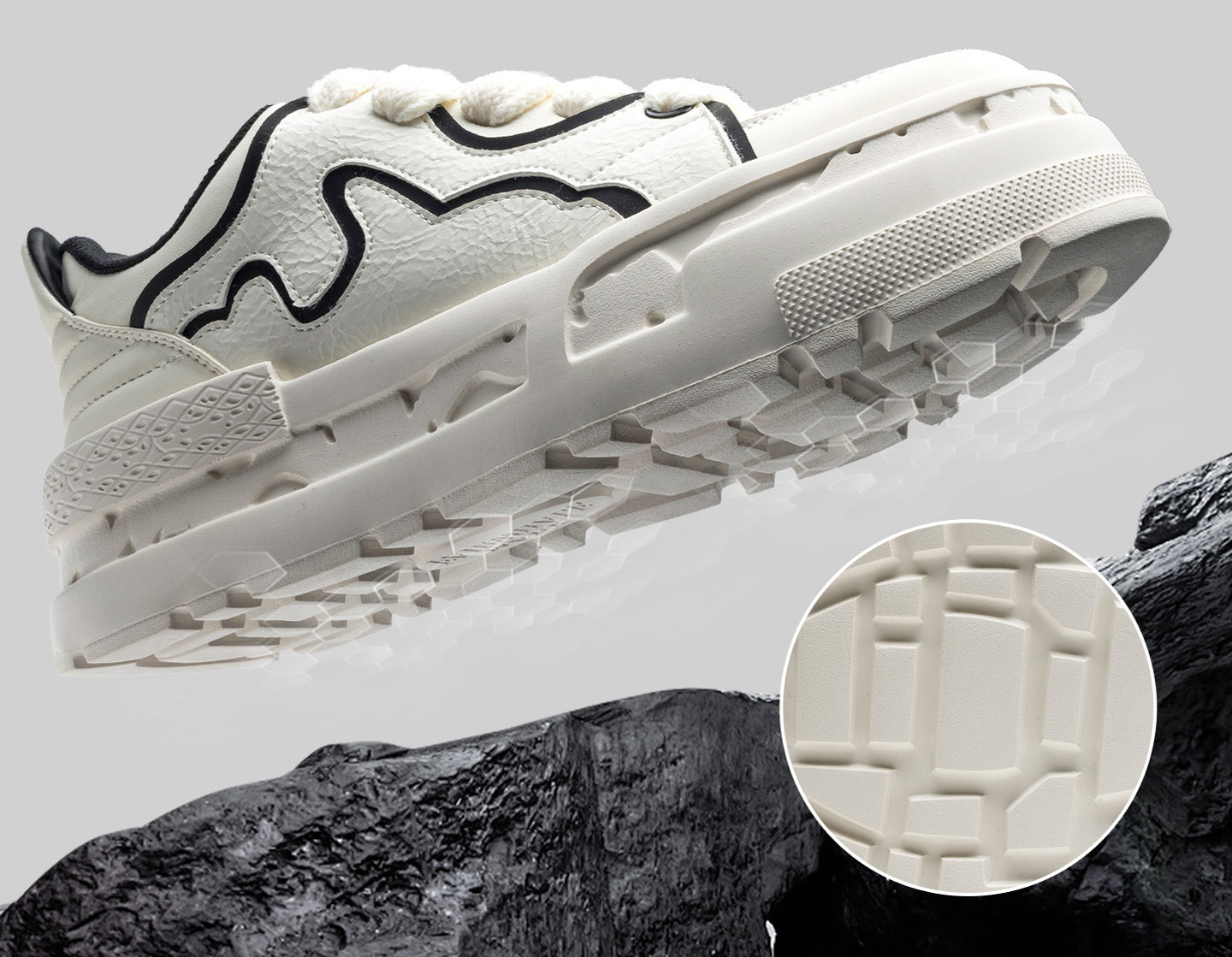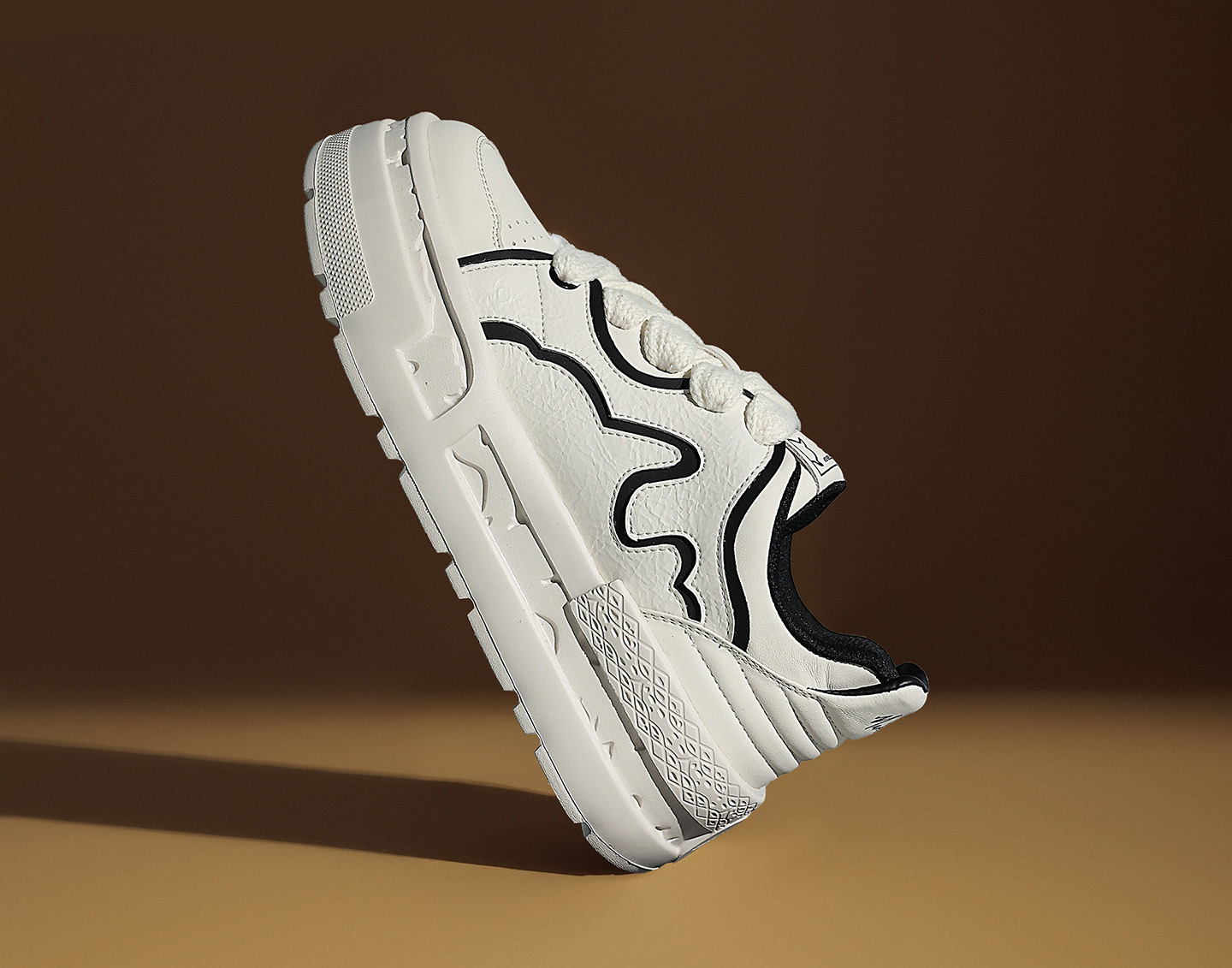 This shoe is available in black and white, featuring wave-patterned panel details and a textured thick sole, with a minimalist silhouette that exudes sleek design flair.