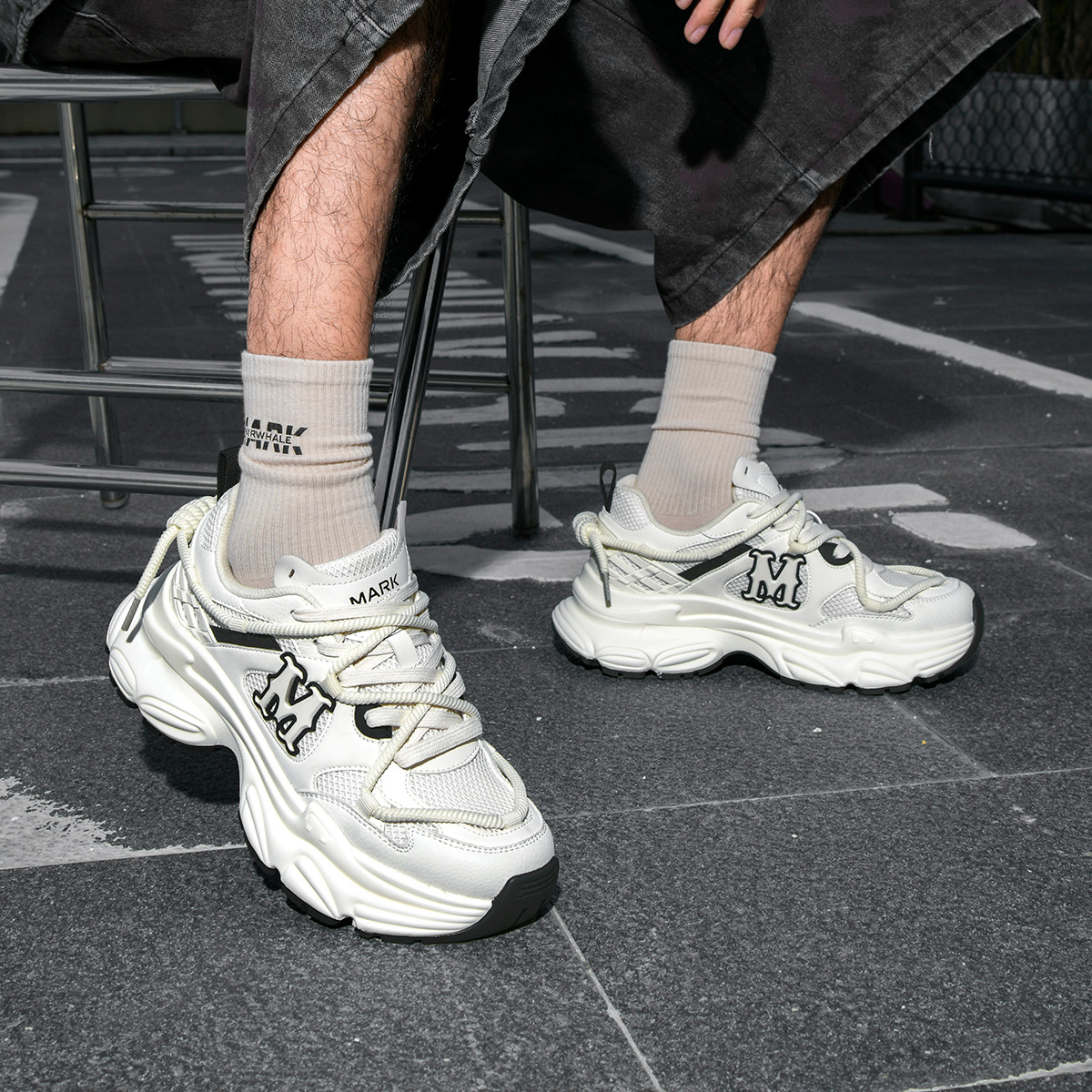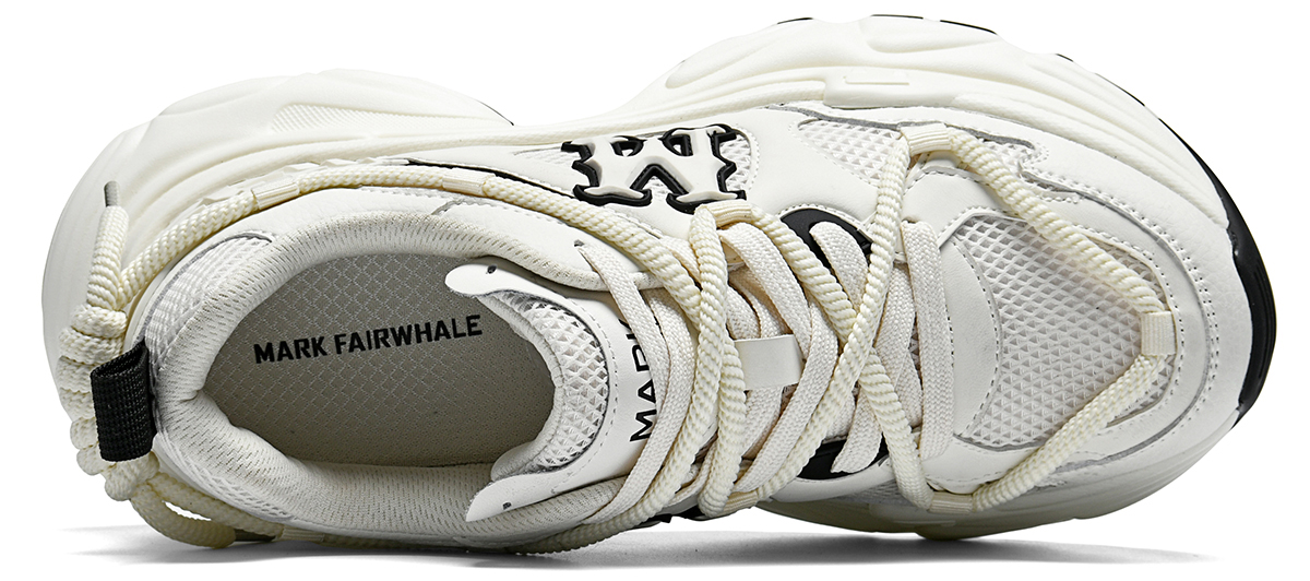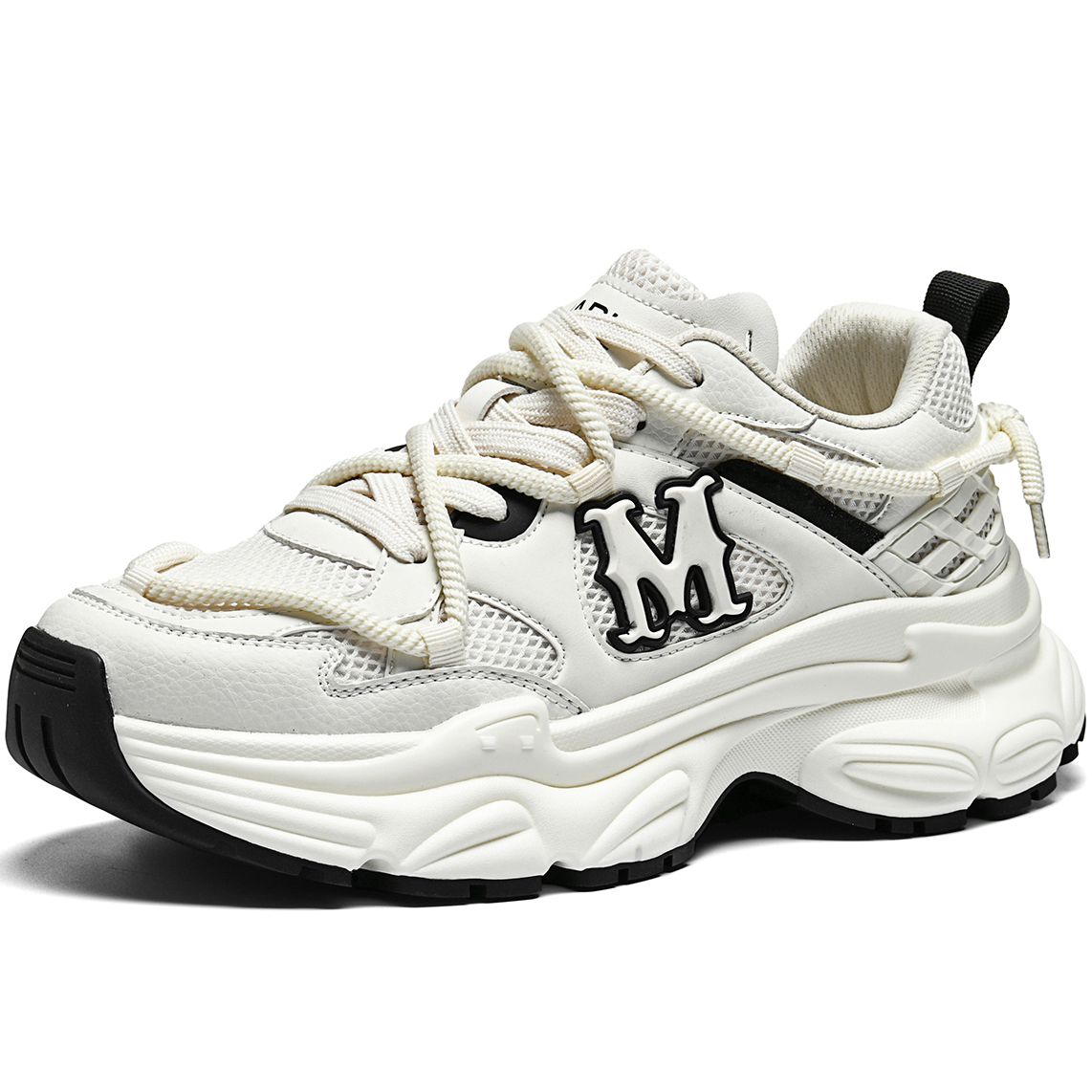 Glossy synthetic leather, breathable mesh, and woven fabric are cleverly combined in the upper: The mesh panels maximize breathability, keeping feet dry, while the mixed materials create a layered, high-quality look. - Oversized 3D “M” Logo