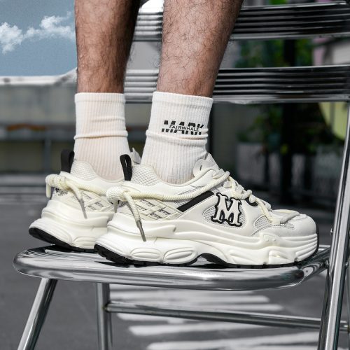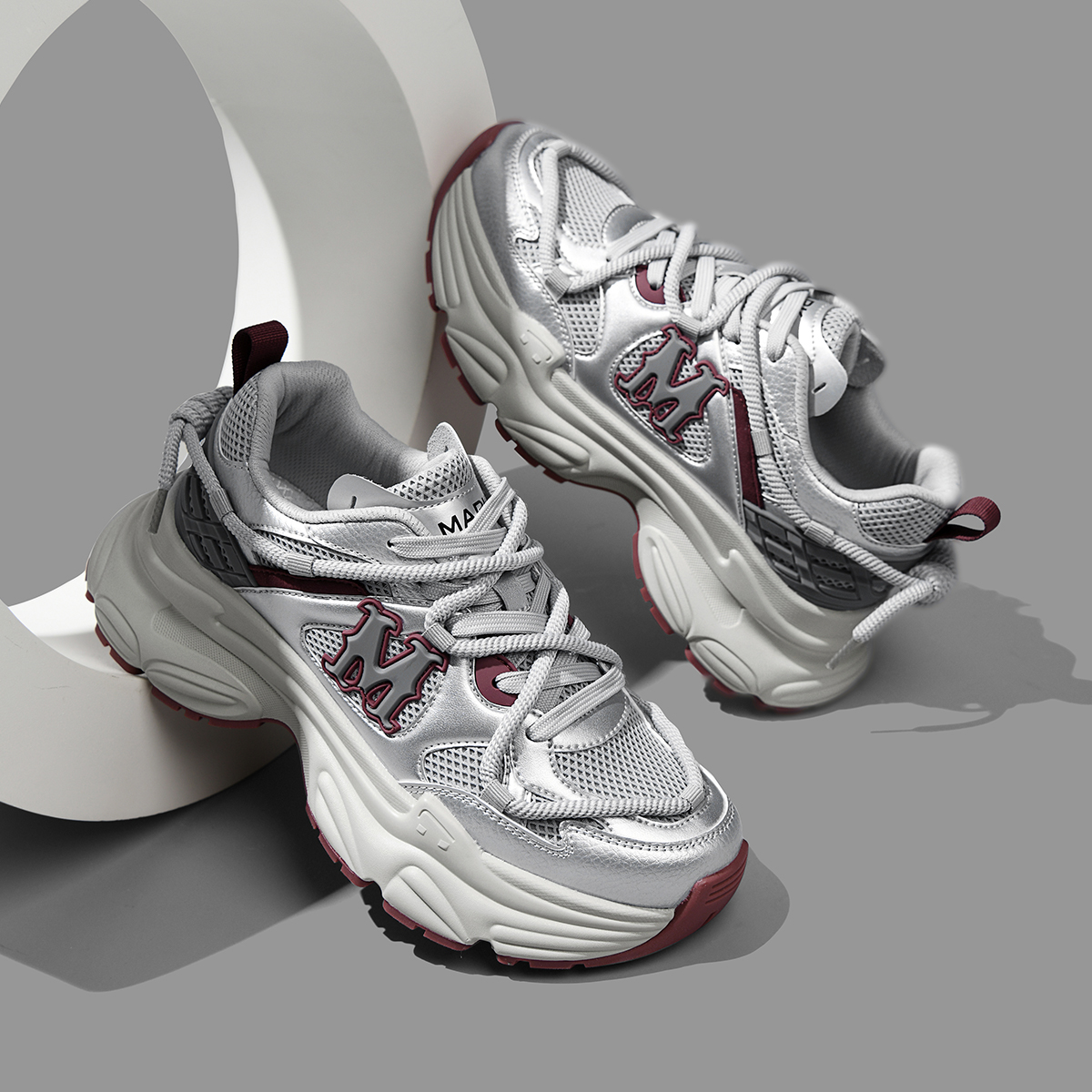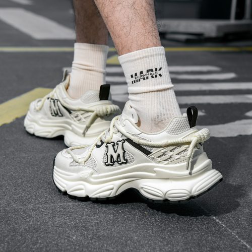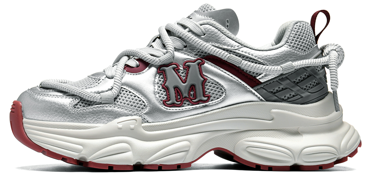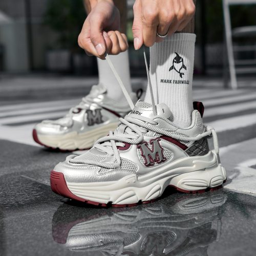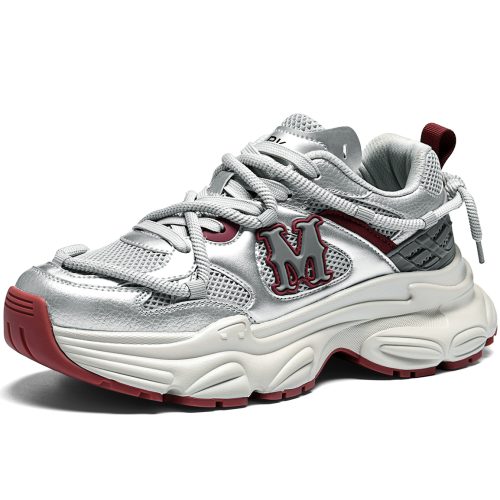 The stylish silver, red, and beige tones create a modern and vibrant look, perfect for year-round wear with casual and trendy outfits. The mixed-material upper (glossy synthetic leather + breathable mesh + woven fabric) combines texture and functionality, while the oversized 3D “M” logo and wrap-around lacing add striking fashion details. This shoe offers both bold style and all-day comfort, making it ideal for everyday wear, street style, or casual gatherings.