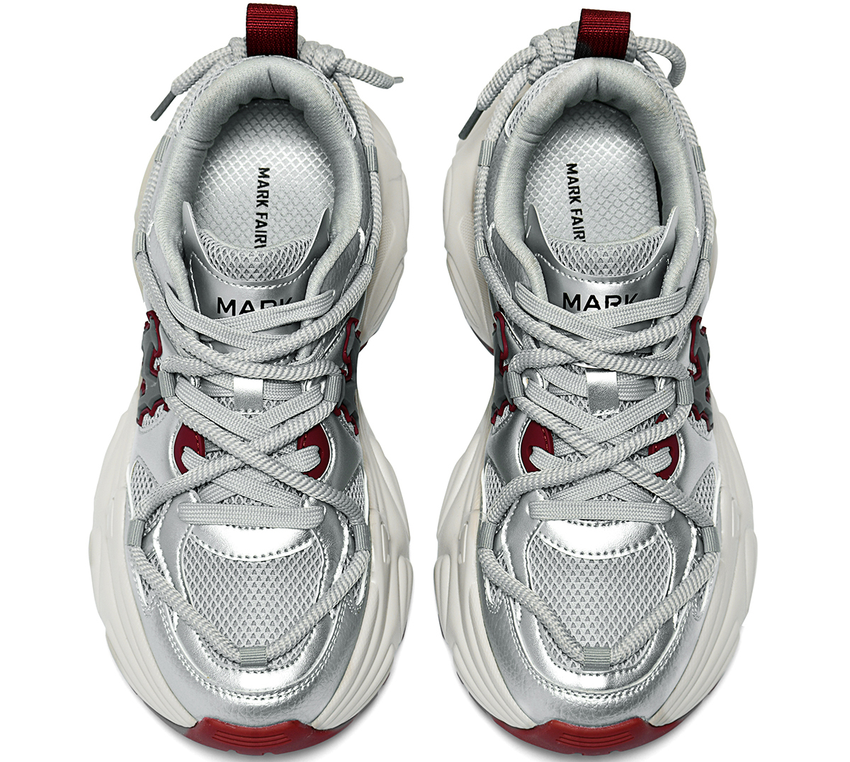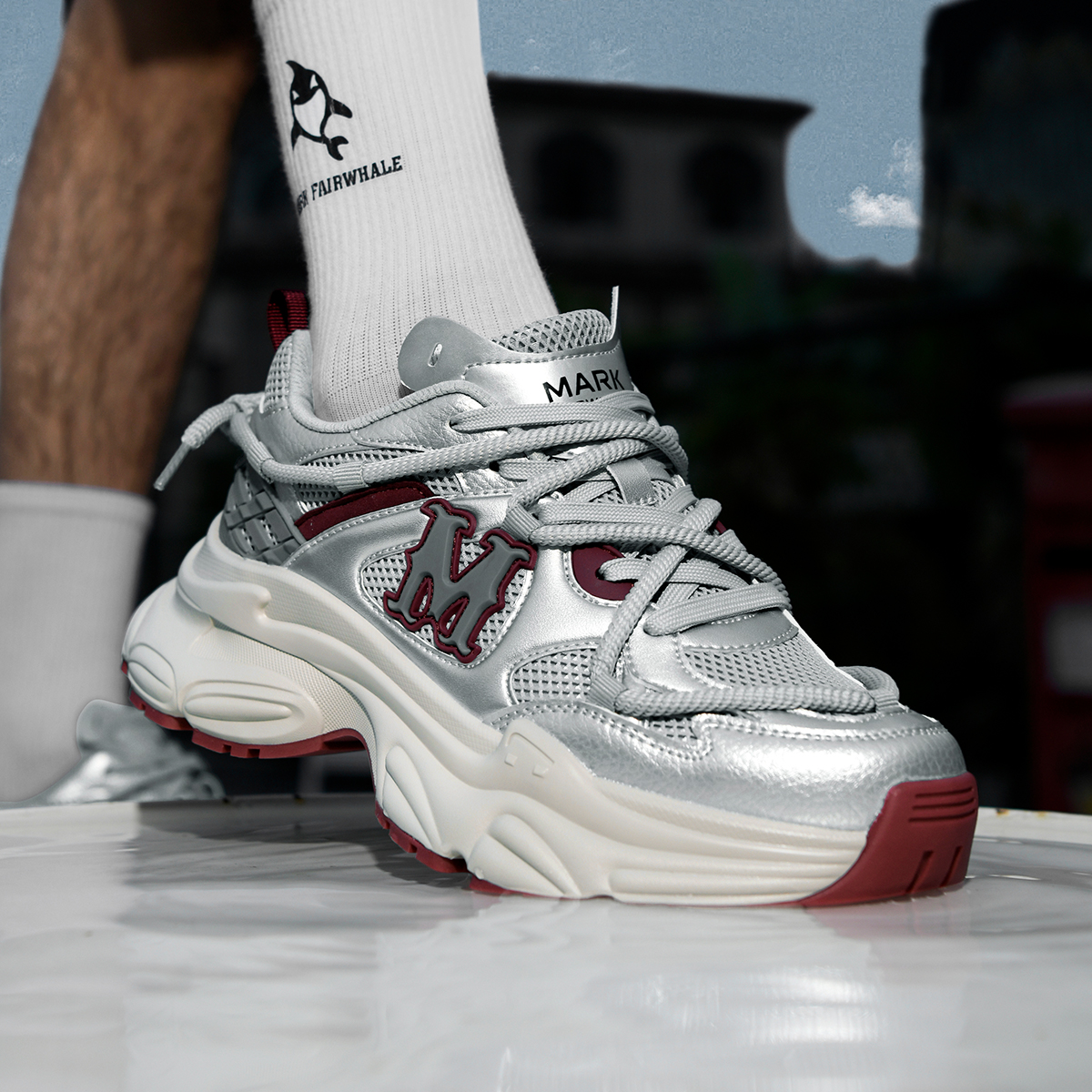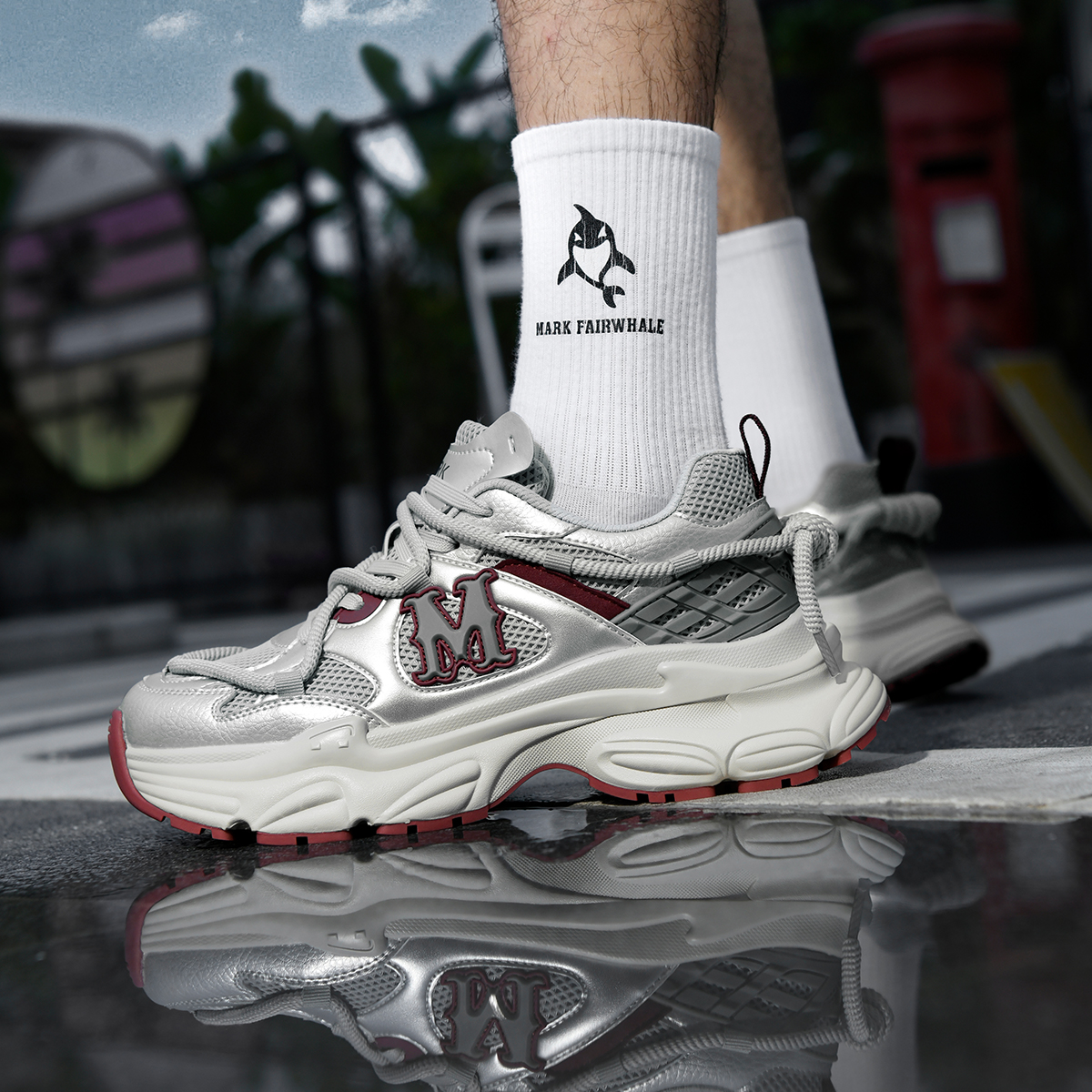 The stylish silver, red, and beige tones create a modern and vibrant look, perfect for year-round wear with casual and trendy outfits. The mixed-material upper (glossy synthetic leather + breathable mesh + woven fabric) combines texture and functionality, while the oversized 3D “M” logo and wrap-around lacing add striking fashion details. This shoe offers both bold style and all-day comfort, making it ideal for everyday wear, street style, or casual gatherings.