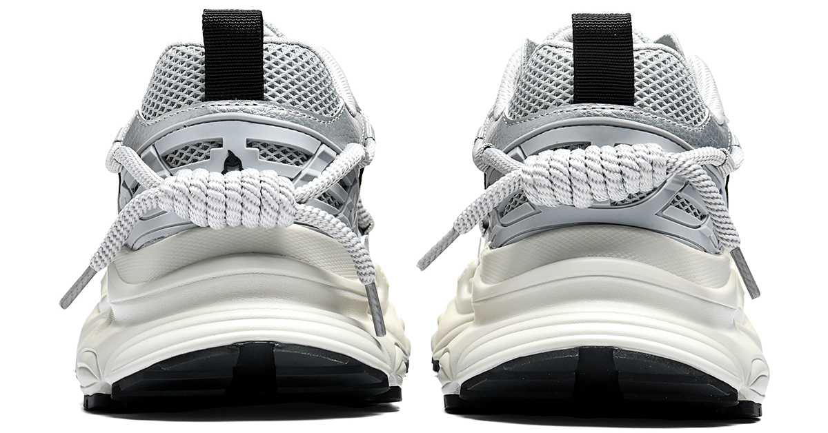 Thick woven laces wrap around the heel: This design enhances rearfoot support while adding a dynamic and eye-catching detail, elevating the sneaker’s fashionable silhouette. - Mixed Material Upper with Mesh Panels