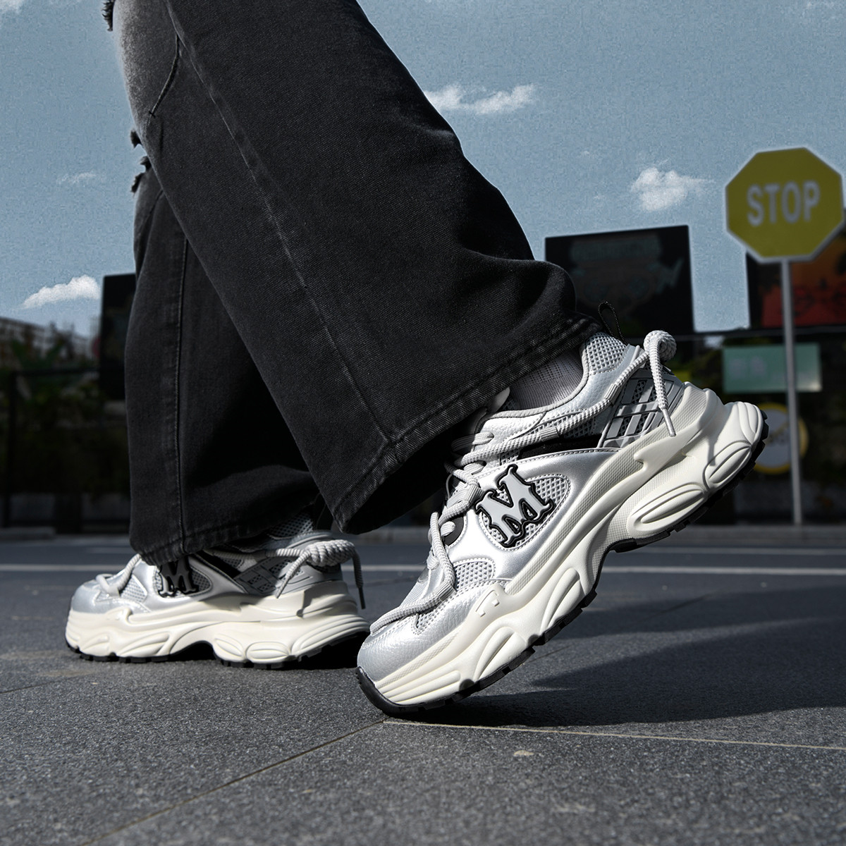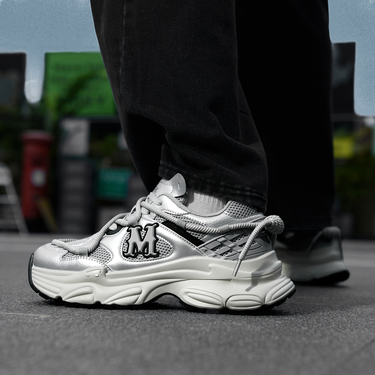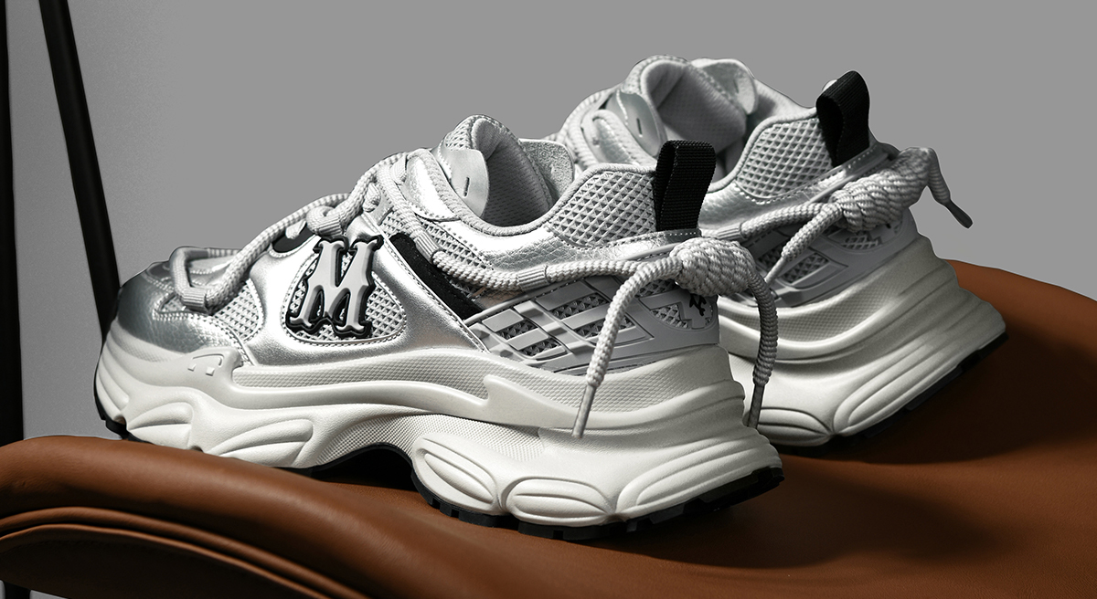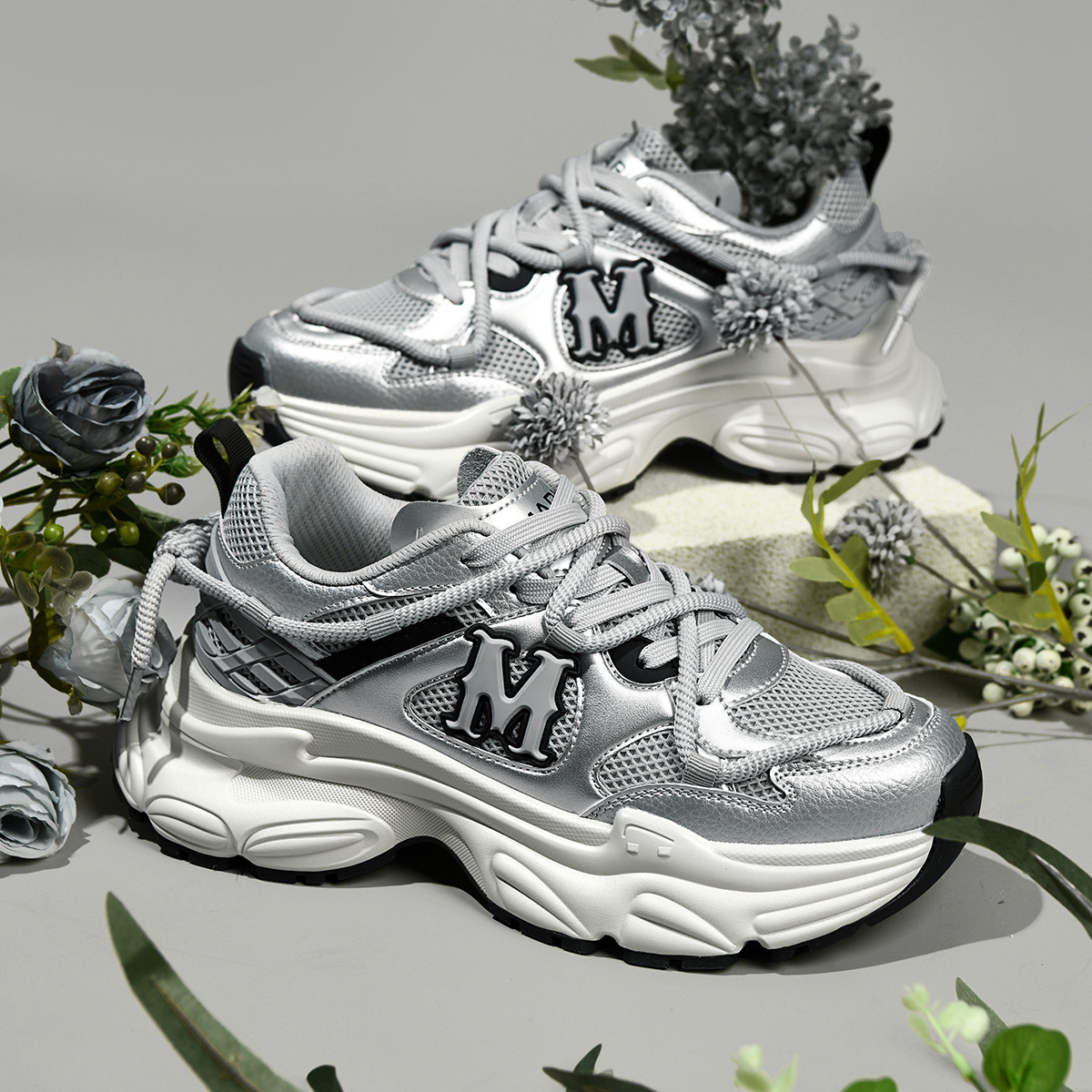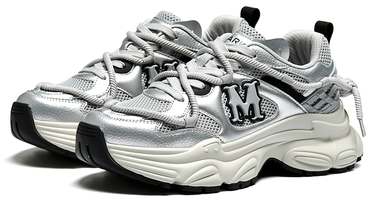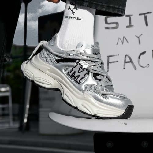 A striking 3D “M” logo: Located on the side of the shoe, it’s a prominent highlight that enhances brand recognition without detracting from the shoe’s sleek silver tones. - Chunky Sculpted Dad Shoe Sole (Height-Increasing Effect)