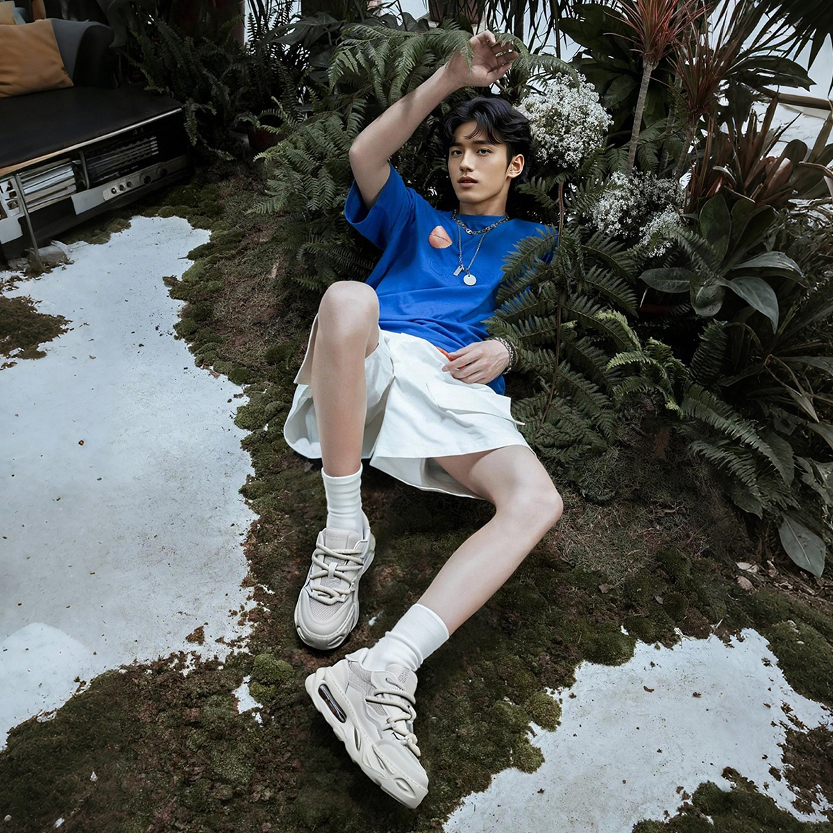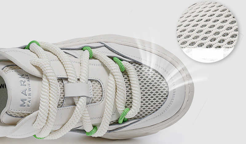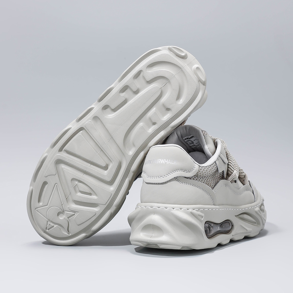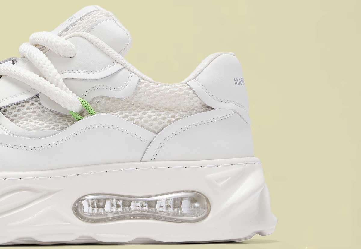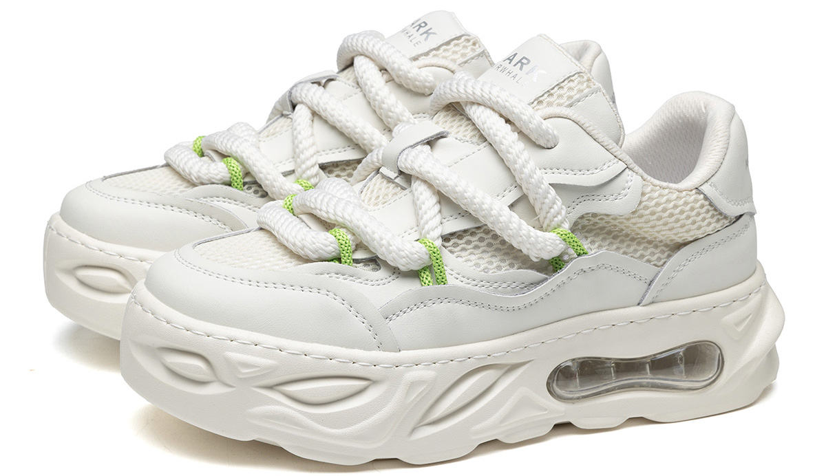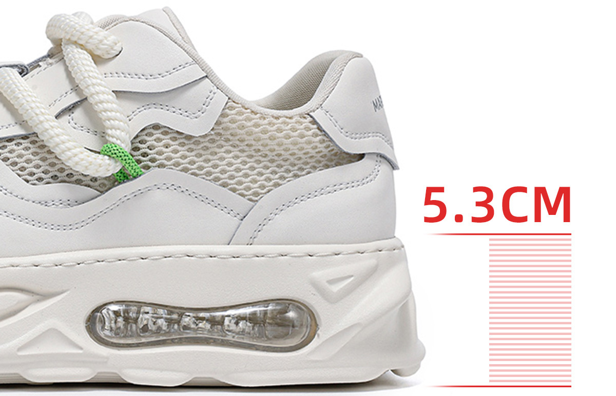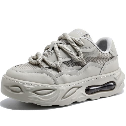 The smooth, light color palette complements various seasons and outfits, while the sporty, fashionable silhouette makes these sneakers ideal for casual wear. A breathable mesh upper combined with a visible air cushion unit provides unparalleled comfort; the rugged woven laces add a touch of edgy charm. These platform sneakers perfectly balance style and function, making them ideal for daily commutes, weekend strolls, or casual gatherings with friends.